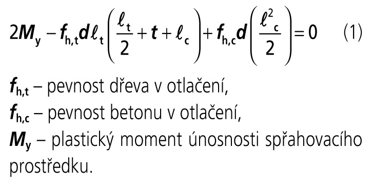 Z rozboru poznatků prezentovaných ve výzkumné zprávě (Hrdoušek, 1993) vyplynulo, že hodnotu pevnosti betonu v otlačení fh,c je možné uvažovat jako čtyřnásobek průměrné hodnoty válcové pevnosti betonu v tlaku fcm. Tomuto odpovídá též deformační tvar hřebíku na obr. 1, neboť lt a lc (podle obr. 2) odpovídají předpokladům rovnic (2) a (3).