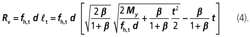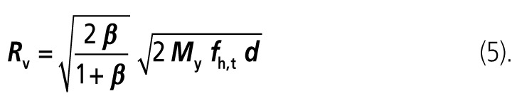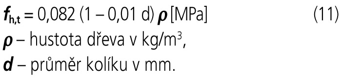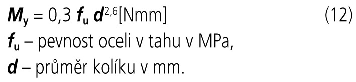 V případě, kdy bude jako spřahovací prostředek použit ocelový kolík, je možné použít následující vztahy (Whale, 1987) pro pevnost dřeva v otlačení fh,t a plastický moment únosnosti My. Únosnost kolíků na vytažení je tak malá, že se zanedbává.