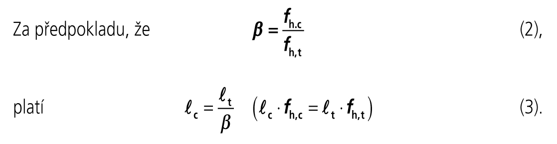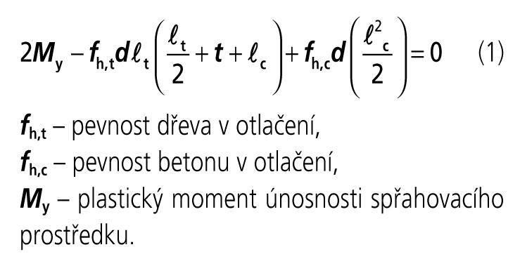 Z rozboru poznatků prezentovaných ve výzkumné zprávě (Hrdoušek, 1993) vyplynulo, že hodnotu pevnosti betonu v otlačení fh,c je možné uvažovat jako čtyřnásobek průměrné hodnoty válcové pevnosti betonu v tlaku fcm. Tomuto odpovídá též deformační tvar hřebíku na obr. 1, neboť λt a λc (podle obr. 2) odpovídají předpokladům rovnic (2) a (3).