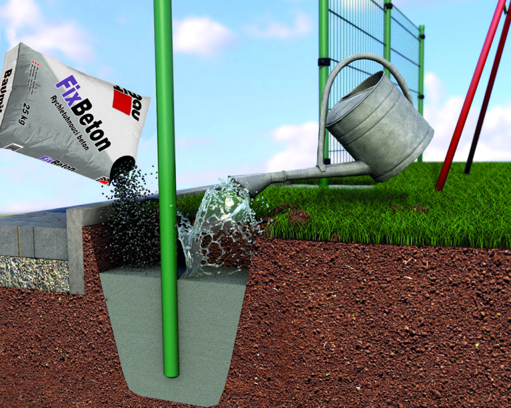 Baumit FixBeton je tedy rychle tuhnoucí betonová směs pro všechny drobné stavební práce v domě i na zahradě spojené s ukotvením vybraných prvků v zemi. Na trh se dodává v zrnitosti 4 mm s třídou pevnosti C 16/20 dle normy EN 206-1. Její obrovskou předností (ale na druhou stranu také jistým úskalím) je počátek tuhnutí již po 10 minutách. Je tedy třeba pracovat s touto směsí poměrně rychle, bez časových prodlev a současně dodržovat určitá pravidla při jejím použití. Z pohledu pracovního postupu a následné zpracovatelnosti se nabízí dva způsoby, jak ukotvení realizovat. Více efektivním způsobem, např. při fixaci plotového sloupku, je rozhodně aplikace „bez míchání“. Do předem vyhloubeného a navlhčeného otvoru v zemi, který by měl být ve všech směrech o 25–30 cm větší než samotný rozměr sloupku (nebo kotevního prvku), nasypeme suchou směs ve vrstvě 10 cm a zalijeme předepsaným množstvím vody. Následně lze tento proces nasypání směsi a zalití opakovat až do požadovaného tvaru betonového kotvení, a nakonec ukončit zahlazením. Takto zalitá vrstva začíná tuhnout a tím částečně fixovat sloupek v požadované poloze již po zmíněných 10 minutách.