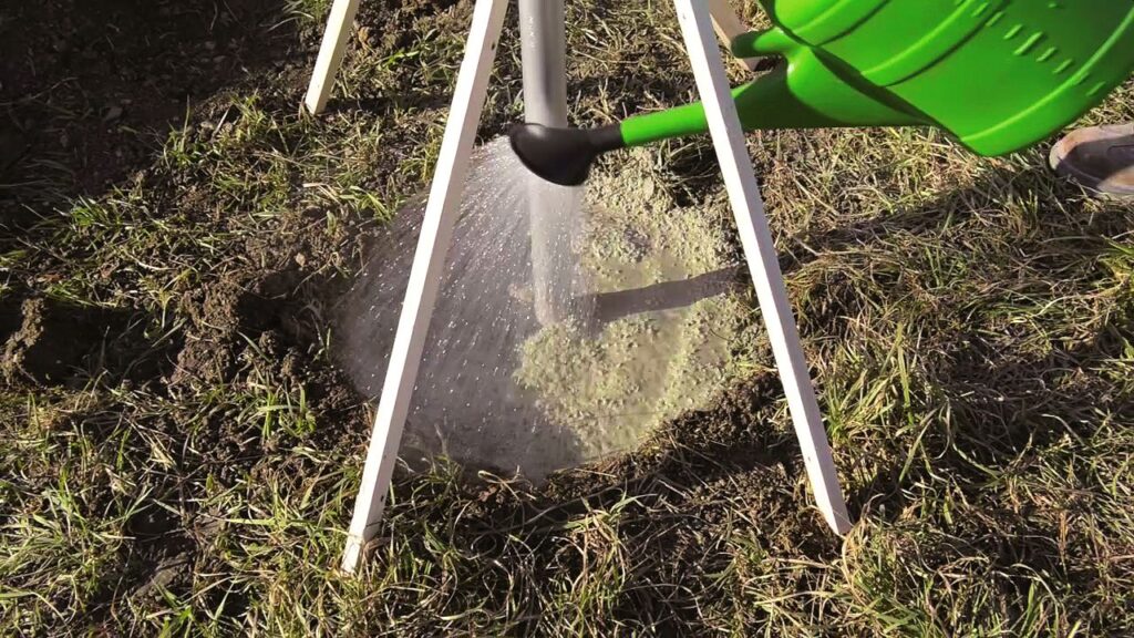 Metoda bez míchání spočívá v zalití 10cm vrstvy suché betonové směsi o v otvoru s usazeným sloupkem.