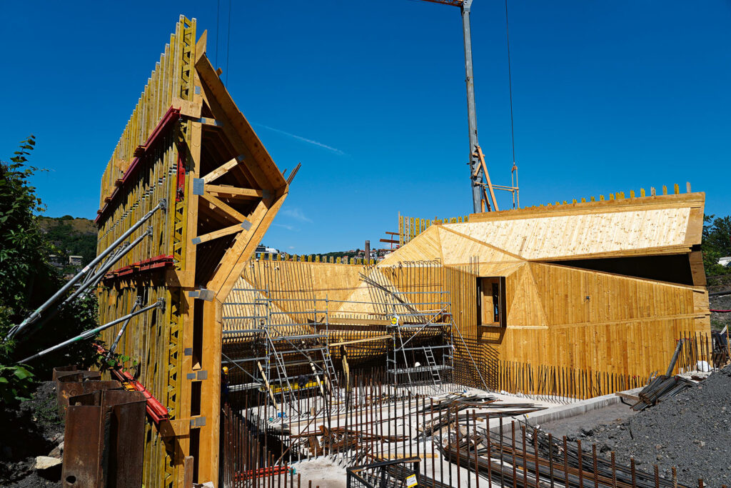 K dosažení požadovaného výsledku bylo potřeba sáhnout po celé škále systémů od PERI. Systém VARIO představoval klíčový prvek pro pohledové části pilířů a opěr. Díky své vysoké variabilitě umožnil přesné přizpůsobení tvarovým požadavkům a architektonickému zadání. Rámové bednění TRIO bylo použito u nepohledových částí opěr a také při výstavbě informačního centra. Jeho předností byla především rychlá montáž. Stavebnice lešení PERI UP sloužila k podepření složitých částí konstrukce. Oceněna byla především jednoduchá a bezpečná montáž i flexibilita systému při řešení specifické geometrie. Stavebnice pro inženýrské stavby VARIOKIT zase kombinovala robustnost, rychlou montáž a maximální přizpůsobivost požadavkům stavby. Vedle bednění a lešení od PERI se hojně využívala i zakázková výroba z tesárny PERI – šlo o unikátní prvky vyráběné podle 3D modelů, které by na místě nebylo možné připravit s dostatečnou přesností. V rámci spodní stavby byla zhotovitelem v menší míře využita i předmontáž jednotlivých částí bednění za účelem zrychlení výstavby. Bylo důležité prefabrikaci naladit tak, aby na sebe jednotlivé díly bezchybně navazovaly.
