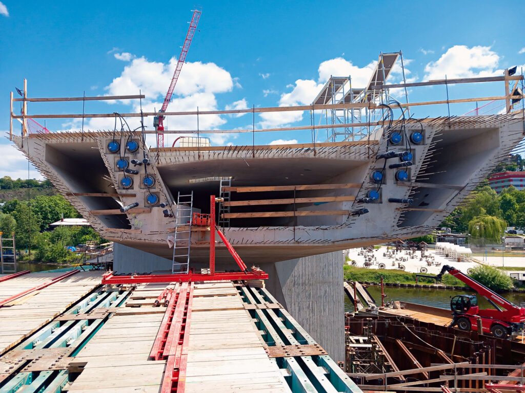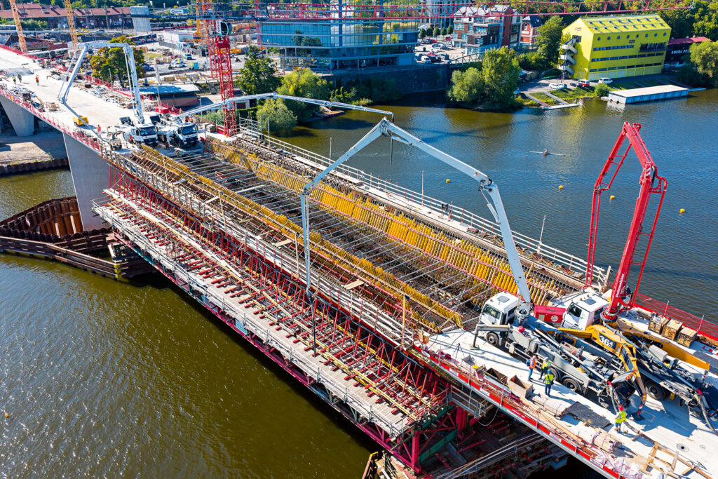 Příčníky jsou příčně předpjaté a s vysokým stupněm vyztužení, proto se jejich realizace také rozdělila na části: „Výztuž se do složitých tvarů pilířů P2, P3 a P6 vkládala až po vyhotovení celé obálky bednění. Zbytek spodní stavby se vyztužoval do částečně předmontovaného bednění, až nakonec jsme celou obálku bednění uzavřeli. Během stavby se tvar položek výztuže několikrát vylepšoval, abychom docílili co nejefektivnějšího postupu vázání. Pro návrh bednění, realizaci vyztužení a samotnou betonáž proto byly zásadní 3D modely všech betonových částí mostu. Každý řez mostovky je jiný, některé spáry jsou navíc šikmé, takže i půdorysná orientace výztuže byla takt od taktu jiná. Most je bez betonové římsy, takže betonáž každého taktu musela být co nejpřesnější s ohledem na výslednou niveletu mostu a dovolené odchylky,“ upřesňuje Ing. Híreš.