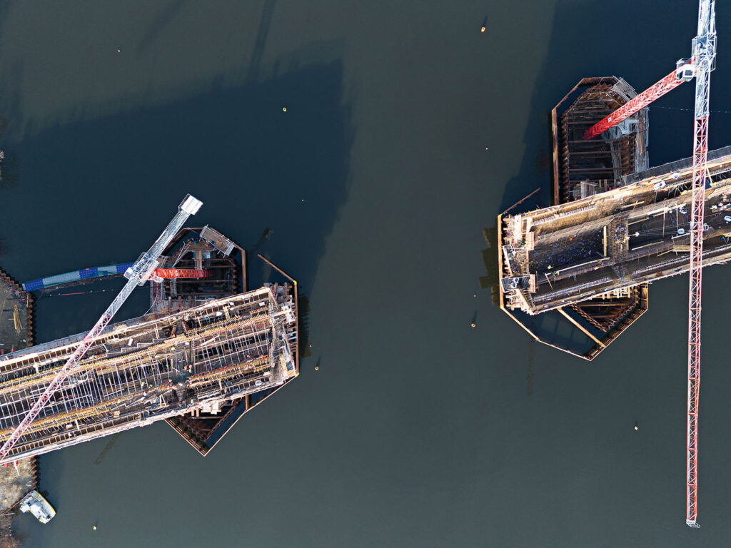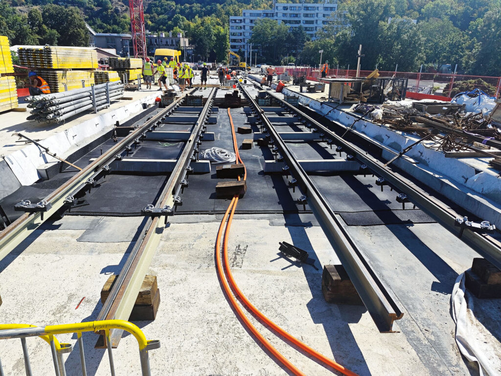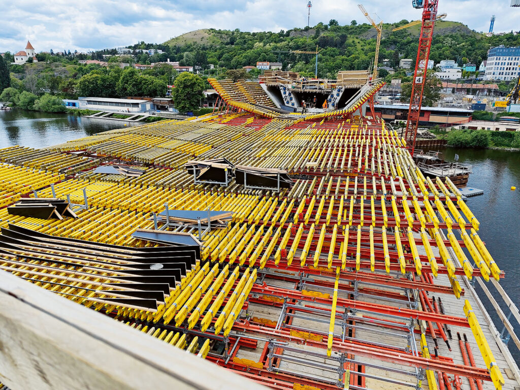 Projekt a stavbu Dvoreckého mostu jsme už představili v druhém letošním čísle – tato vysoce atypická stavba se blíží k finále. Během léta už byly propojeny mostovky smíchovské a podolské strany, stavěla se pevná jízdní dráha, nyní se demontuje bednění a dočasná skruž prostředního pole. Probíhá také instalace odvodnění a kabelových drah v komoře mostu, pokračuje se v pracích na izolaci mostovky a na pevné jízdní dráze, montuje se ocelová konstrukce cyklistické rampy.