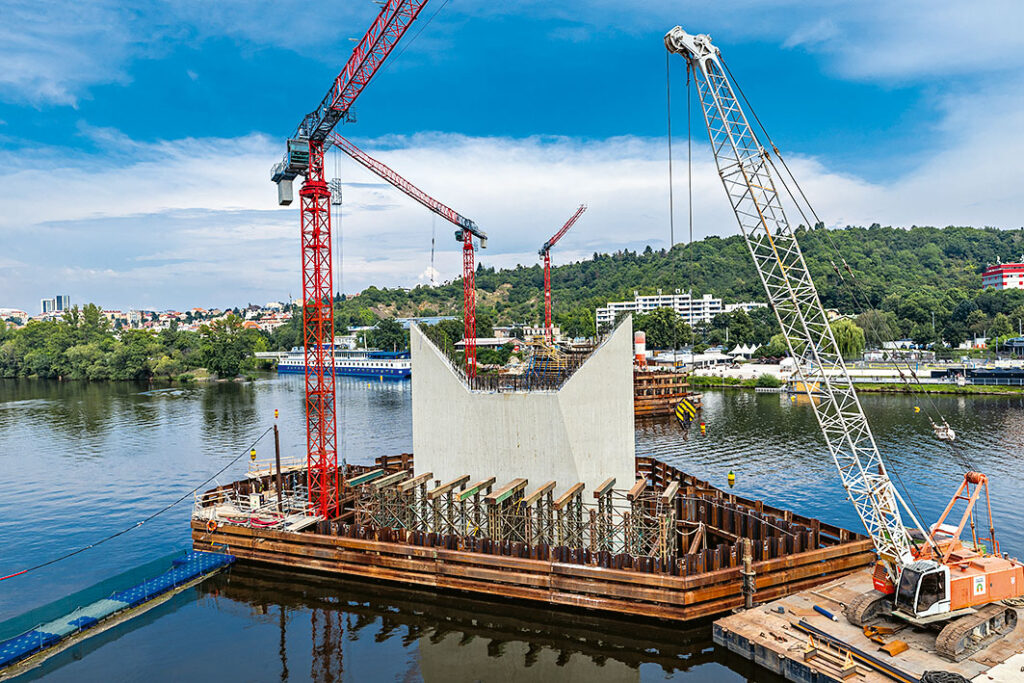 Stavba mostu začala na podzim v roce 2022, mostovka byla rozdělena na šest betonážních taktů, letos na jaře se dokončovaly čtvrtý a pátý: „Stavěli jsme proti sobě, nejdřív se z různých důvodů postavila trojka, pak jednička a poté dvojka… Nastaly totiž různé komplikace, například při zakládání v ulici Strakonická se objevil neznámý mostní objekt; kdysi byla na břehu Vltavy pila, ke které tento most vedl. Na straně Podolí jsme zase řešili, jak ochránit vedení předpínacích kabelů před betonářskou výztuží z důvodů bludných proudů. Letos v srpnu jsme dokončili hlavní betonáž obálky a stěn posledního taktu č. 6, na začátku září proběhla betonáž horních desek tohoto taktu. Během léta už jsme také budovali pevnou jízdní dráhu pro tramvaje, která se skládá z dvou prostých betonových desek – spodní část kolejnice je ukotvená v první desce, finální povrch je z litého asfaltu. Ulice Na Zlíchově už je na most napojena, pevná jízdní dráha pro mostní pole č. 1, 2 a 6 už je hotová. Tramvajovou jízdní dráhu bychom chtěli dokončit během podzimu, nejpozději do Vánoc. Pak ještě doladíme asfaltový povrch chodníků na mostě i s ohledem na klimatické podmínky, úplně nakonec se budou napojovat tramvajové trakce, provede se zatěžovací zkouška mostu a hlavní mostní prohlídka,“ uvádí Ing. Maroš Híreš z Metrostavu TBR.