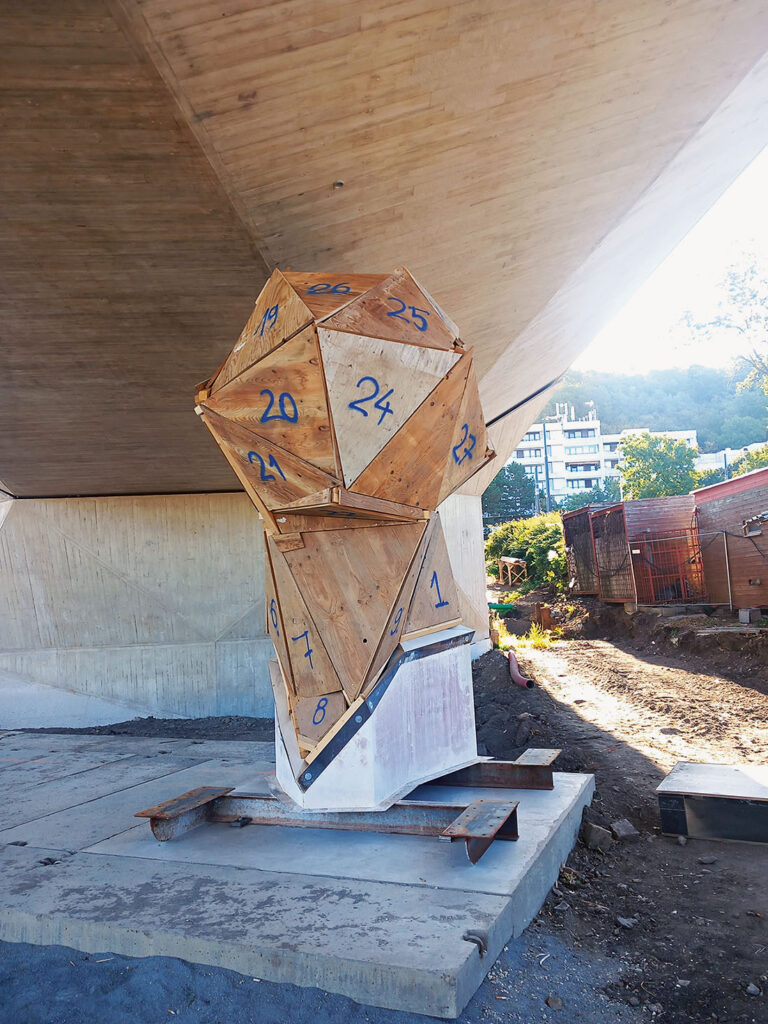 Ing. Híreš dodává: „Část bednění byla systémová, ale museli jsme řešit, jak vytvoříme přesný nalámaný tvar – docílilo se toho mimo jiné pomocí dřevěných, přesně navržených ramenátů do bednění. Zapojili jsme proto několik firem, i z důvodu jejich kapacity. Bylo to správné rozhodnutí, zadání bylo opravdu složité. Navíc jsme některé betonáže museli zpomalovat, aby bednění s omezeným spínáním udrželo tlak čerstvého betonu. Nesměly vzniknout viditelné linie jednotlivých vrstev betonu – postup betonáže se předem stanovil s ohledem na zpracovatelnost betonu, klimatické podmínky a způsob dopravy betonu do bednění. Například u pilíře P2 jsme museli přistoupit k betonáži pomocí bádie, abychom docílili požadované rychlosti betonáže s ohledem na maximální tlak betonu na bednění. Výztuž pilířů a opěr jsme navíc museli zpracovat v poměrně úzkých komínech 60 × 60 cm, kde stál zedník, který beton vibroval a hlídal jeho zpracovatelnost. Betonářskou výztuž bylo těžké navrhnout vzhledem ke tvaru mostovky, situaci komplikovaly i předpínací kabely – jejich kanálky kopírují spodní povrch, který se zužuje a zase rozšiřuje, takže v určité části jsou ve spodní desce, pak zase ve stěně, putují. Zkoordinovat po celé trase vázání betonářské výztuže a kladení chrániček pro kabely předpětí bylo složité, takže na rozdíl od běžných mostů probíhalo vázání betonářské výztuže po kratších úsecích a bylo neustále přerušováno postupným vkládáním chrániček předpětí.“