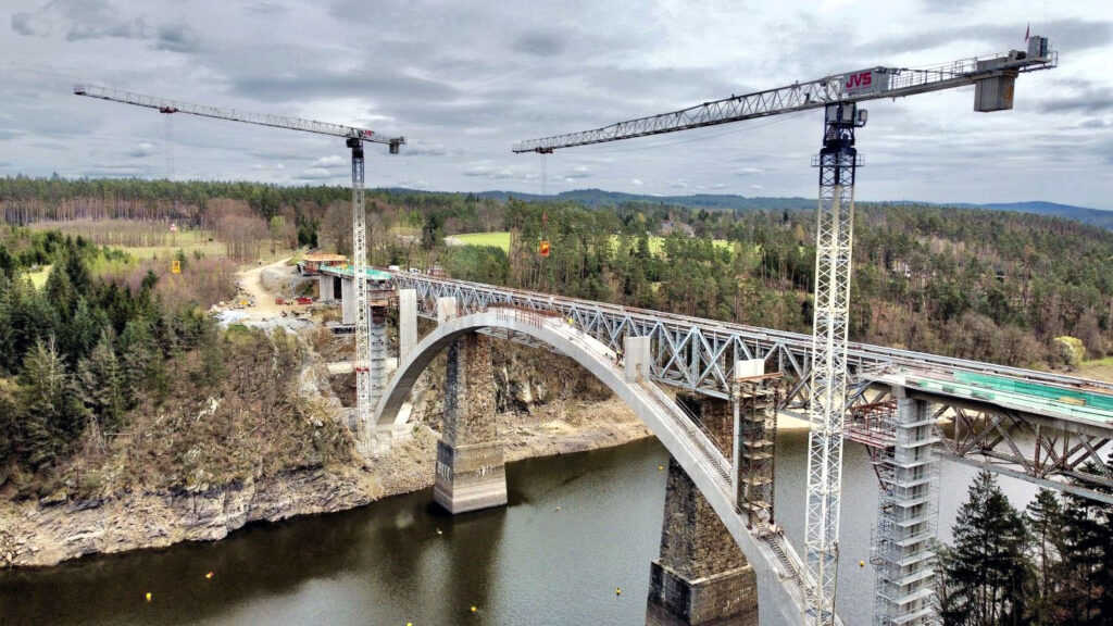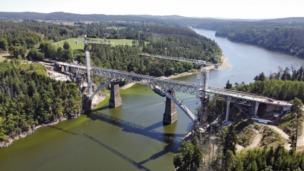 Nový železniční most přes orlickou přehradu u obce Červená měří na délku 316 m a jeho železobetonový oblouk je s rozpětím 156 m největší v České republice.