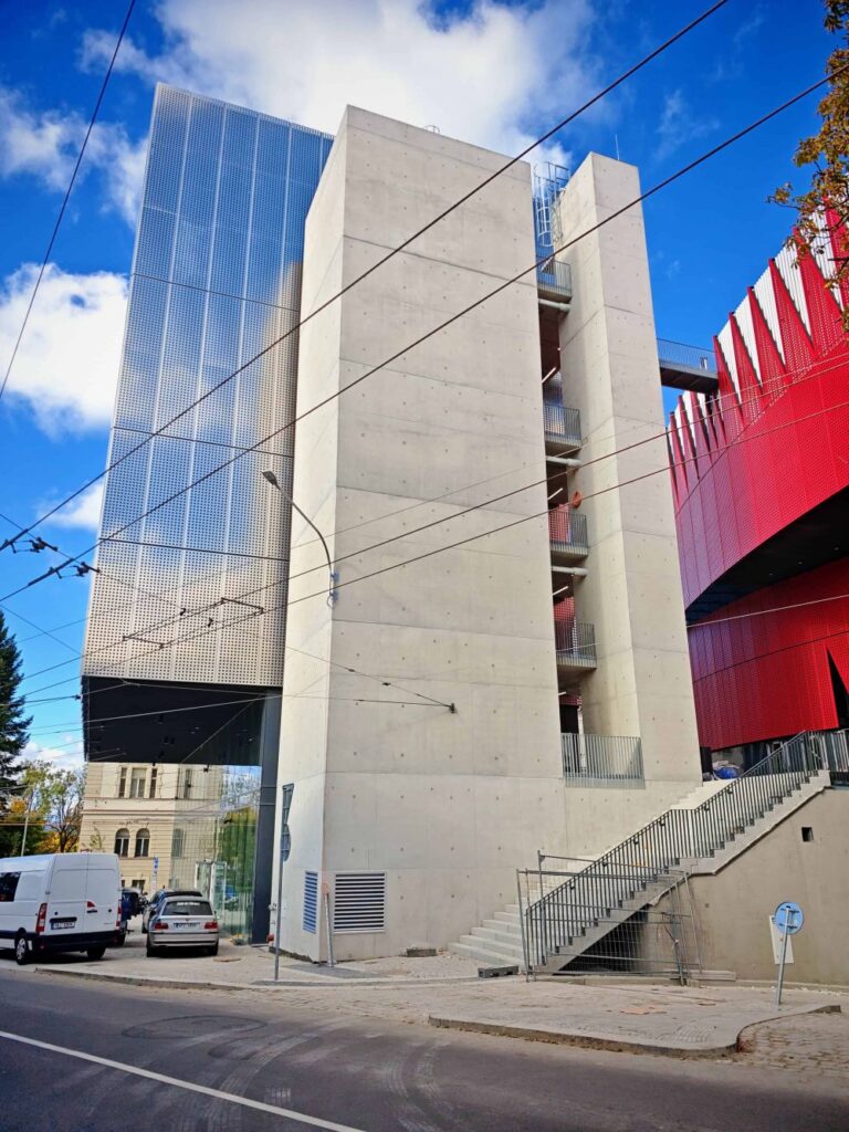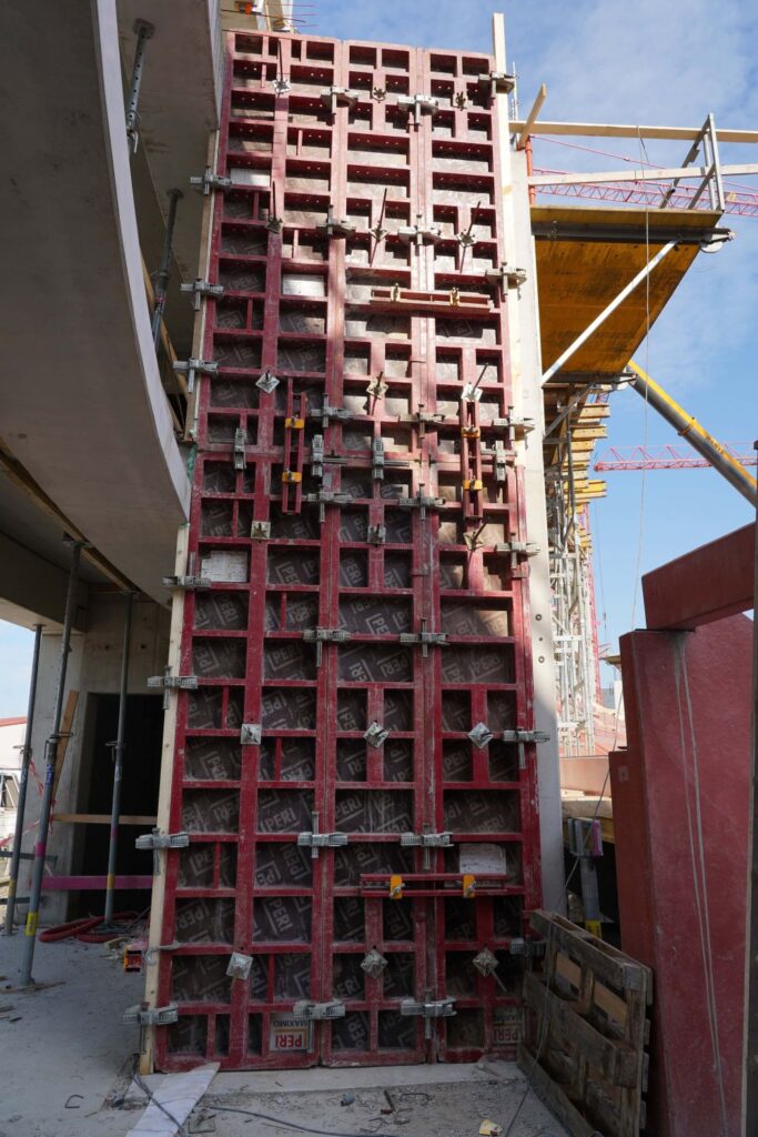 Dále bylo využito nosníkové stěnové bednění VARIO, a to tam, kde bylo nezbytné docílit špičkové kvality pohledového betonu. Variabilita systému umožnila přesné přizpůsobení bednicích ploch architektonickým nárokům i požadovaným spárám. Pro bednění obloukových stěn se uplatnilo kruhové bednění RUNDFLEX, díky kterému bylo možné realizovat křivkové části konstrukce v požadované kvalitě pohledového betonu a bez kompromisů v přesnosti. Podpěrná věž ST 100 doplnila ostatní systémy PERI při bednění průvlaků a částí stropů; jejími hlavními výhodami byly rychlá montáž, flexibilita a spolehlivost při přenášení zatížení.