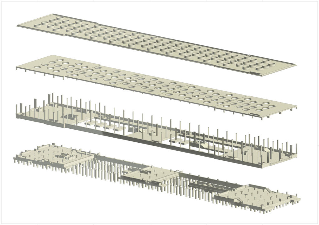 Nejprve bylo nutné nalézt řešení pro návrh samotné ploché střešní desky na sloupech, u níž nebylo možné použít tradičních návrhových postupů. Kvůli hustému rastru velkých prosvětlovacích kruhových otvorů a požadavku na co nejmenší tloušťku desky nebylo možné použít obvyklé řešení s návrhem výztuže skrytých hlavic nad sloupy, zároveň jsou deska se sloupy jedinými prvky zajišťujícími vodorovnou stabilitu konstrukce. Bylo proto použito neobvyklé návrhové řešení metodou příčných a podélných skrytých průvlaků v tloušťce desky, které jsou momentově (rámově) výztuží spojeny se sloupy a dohromady tak tvoří několikapólové momentové rámy zajišťující jak svislou, tak vodorovnou únosnost. Ačkoliv tedy deska vizuálně působí jako plochá na sloupech, ve smyslu statického návrhu jde ve skutečnosti o obousměrný rastr nosných průvlaků, které vynášejí desku stejné tloušťky, jako je výška průvlaků. Únosnost ve smyku pak zajišťují třmínky těchto průvlaků, skryté v tloušťce desky.
