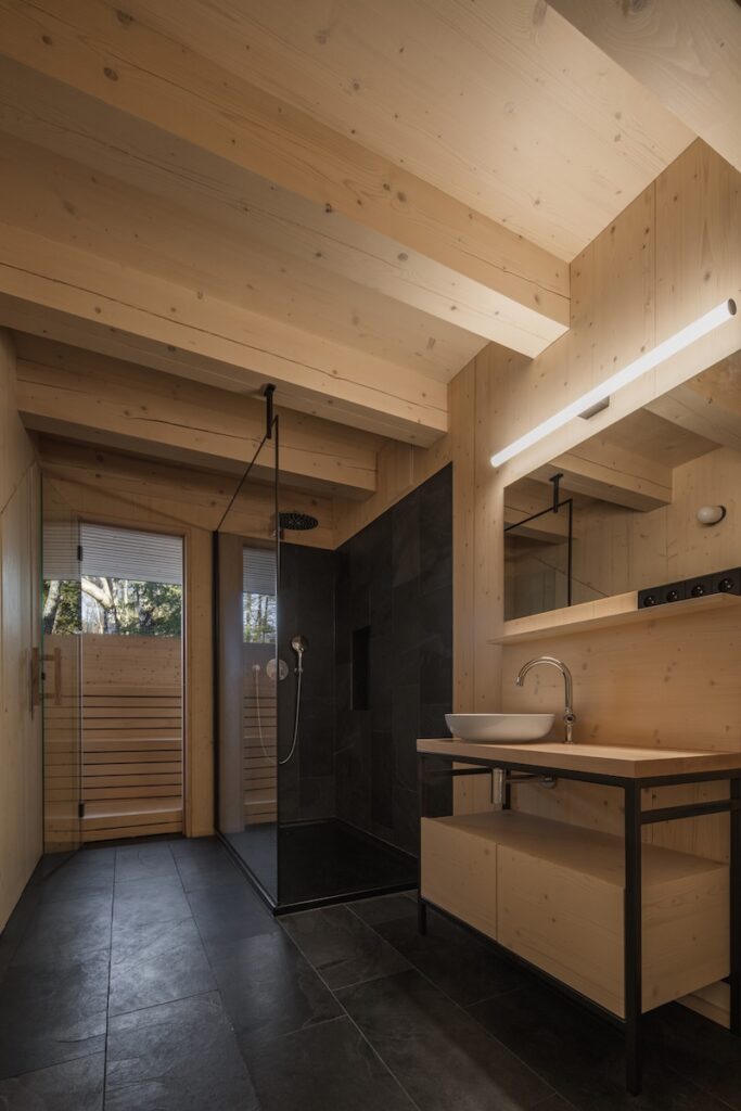Materiály byly volené tradiční, v barevnosti původních stavení – tmavě mořené dřevo na fasádu, místní recyklovaný kámen na podezdívky a terasy. V okolí časté zelené okenice byly inspirací pro větrací otvírky doplňující bezrámové zasklení oken.