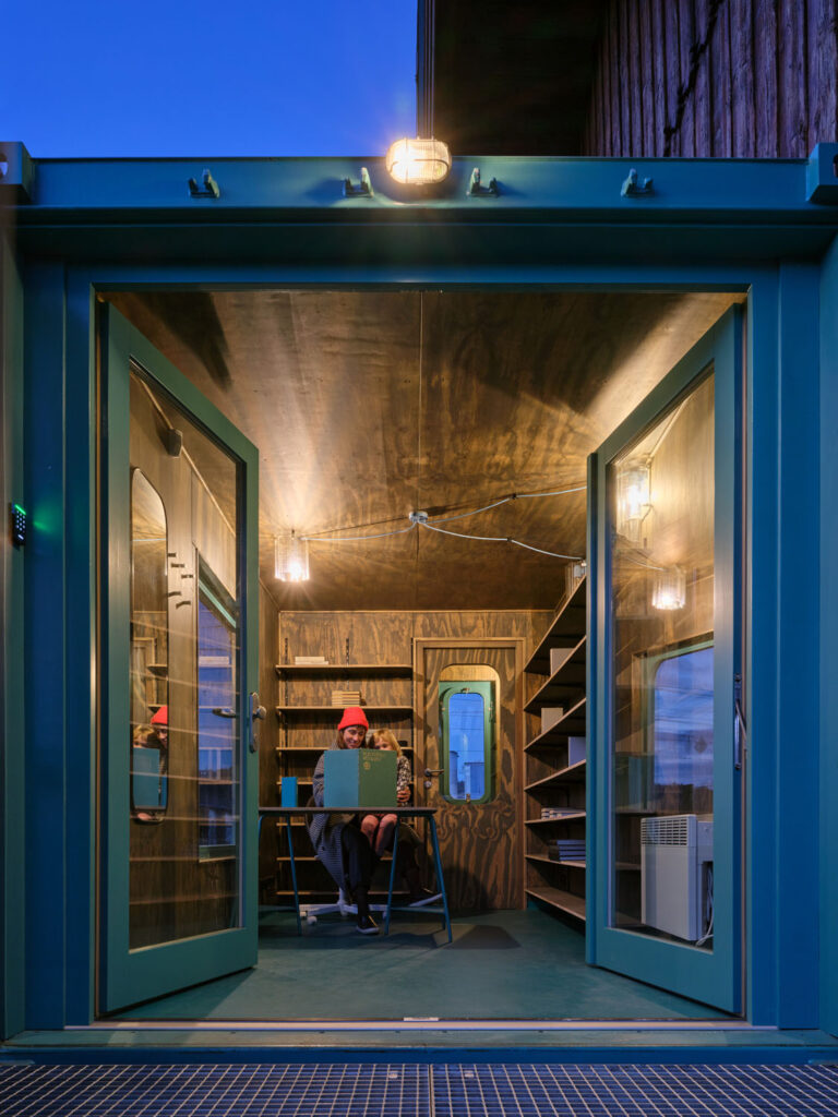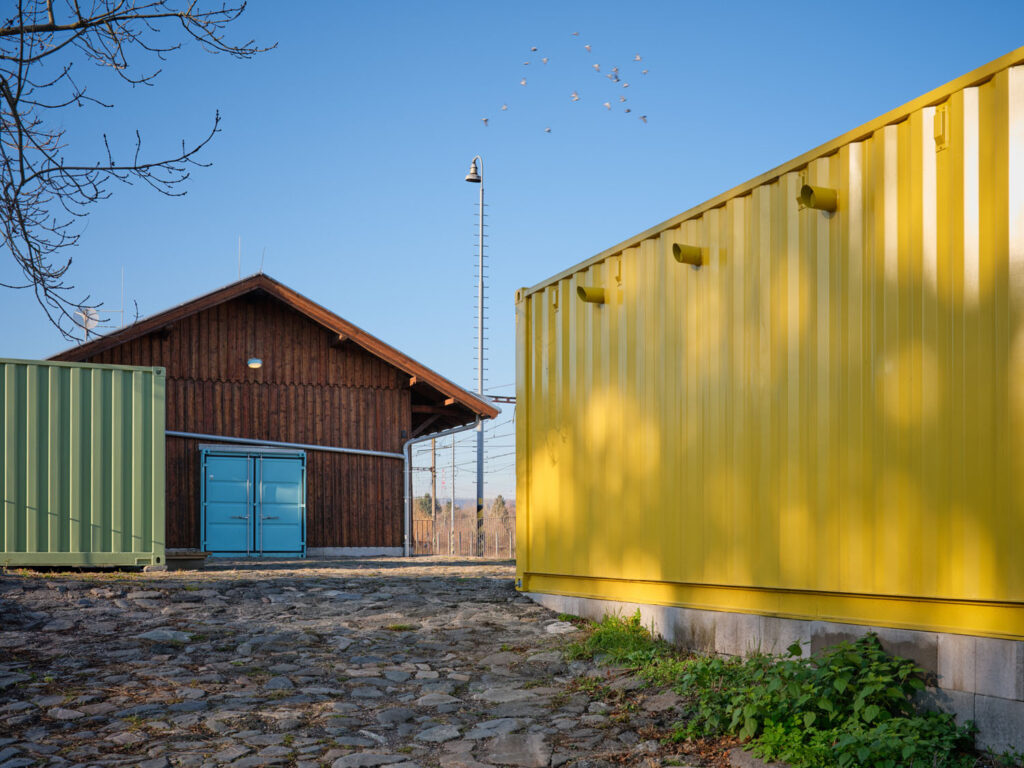 Další tři použité repasované lodní kontejnery slouží jako zázemí kulturního sálu a stojí každý samostatně vedle něj. Srozumitelně vyjadřují, co je původní a co nové. Jejich obálka z ocelového trapézového plechu je v kontrastu k původnímu prkennému Dřeváku, materiálově ale navazuje na železné vagóny, které každou chvíli projíždějí kolem. Kontejnery jsou zateplené, jejich okna mají zaoblené rohy jako ve vlaku. Každý kontejner má svoji výraznou barevnost, která se opakuje i v jeho interiéru. Podélná i čelní rampa byly směrem do ulice doplněny o průběžný sedací/přístupový stupeň. To stavbu významně propojilo s veřejným prostorem. Vůbec celé venkovní prostranství Dřeváku se díky místu k sezení pod střechou i pod nebem stalo oblíbeným místem pro pobyt lidí i mimo dobu konání akcí. Mimořádně výhodné je totiž umístění stavby: vedle vlakového nádraží a naproti přestupnímu uzlu regionálních autobusů, v blízkosti parkoviště i pár kroků od centra Řevnic.