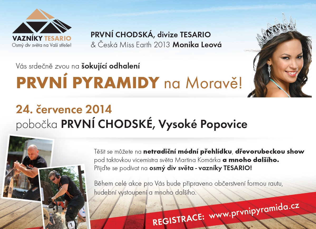 Nikde jste neviděli pyramidy naživo? Teď už nemusíte jezdit do Egypta, pyramidy přišly k nám do České republiky – přesněji na Moravu! Šokující odhalení PRVNÍ PYRAMIDY na Moravě proběhne již toto léto! PRVNÍ CHODSKÁ, výrobní divize TESARIO, společně s Českou Miss Earth a televizní moderátorkou Monikou Leovou vás všechny srdečně zvou ve čtvrtek 24. července 2014 od 14 h na pobočku PRVNÍ CHODSKÉ ve Vysokých Popovicích, kterou najdete necelých 30 km od Brna.