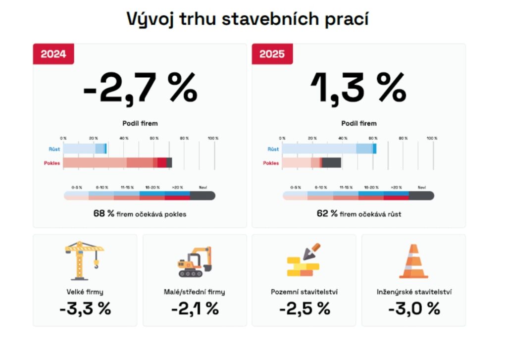 Vývoj trhu stavebních prací se aktuálně propadá. Meziroční srovnání stavební produkce je vypočteno z posledních dvanácti měsíčních indexů ČSÚ (klouzavý rok za 12 měsíců zpětně). Trh stavebních prací aktuálně představuje pokles −1,5 %. Inženýrské stavitelství meziročně klesá dokonce o 4,6 %, zatímco pozemní stavitelství stagnuje (−0,3 %). Je to horší vývoj, než vykazuje průměrně produkce stavebnictví v Evropě. Z mírného růstu ke stagnaci směřuje srovnatelný index EU27, který je aktuálně na hodnotě +0,5 %, protože v uplynulých měsících stavebnictví meziročně ztrácelo ve většině evropských zemí.