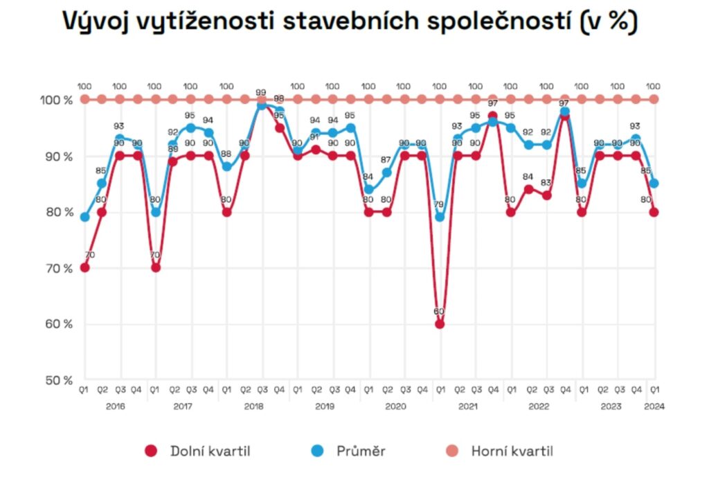 Kapacity stavebních společností pokračují stále v poměrně vysoké úrovni vytížení (93 %). Vysoká kapacitní vytíženost je v době, kdy predikce směřují směrem dolů, dána především setrvačností zakázek, které jsou nasmlouvány z minulých období. Vytíženost kapacit na příští rok podle ředitelů stavebních společností výrazně klesne. Pro příští měsíce očekávají, že průměrně klesne vytíženost kapacit na 85 %. Podle poloviny ředitelů stavebních společností (48 %) je vytíženost kapacit ve srovnání s minulým obdobím již nyní nižší. Některé společnosti nyní mají zakázky pouze na dva až tři měsíce.