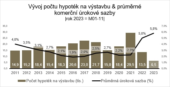 Graf názorně ukazuje vývoj počtu nově nabíraných hypoték na výstavbu v souvislosti s vývojem úrokových sazeb – období 01/2011 – 11/23.