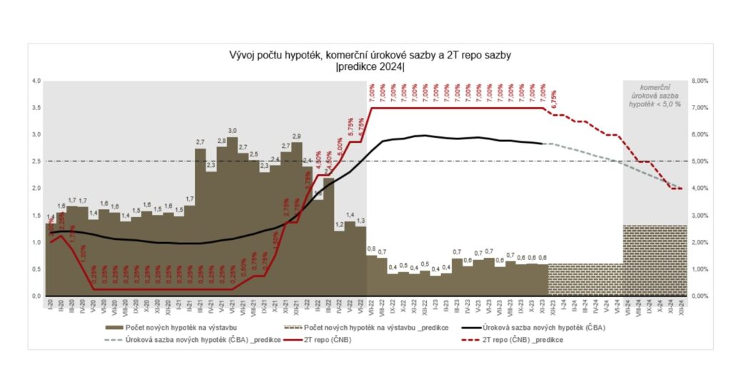Graf ukazuje měsíční vývoj komerční úrokové sazby nových hypoték (ČBA) a 2T repo sazby (ČNB) za období leden 2020 – prosinec 2024. V období od ledna 2024 se jedná o predikci možného vývoje úrokových sazeb na trhu a počtu nových hypoték na výstavbu. Graf také zobrazuje vývoj počtu nových hypoték na výstavbu za období leden 2020 – listopad 2023.