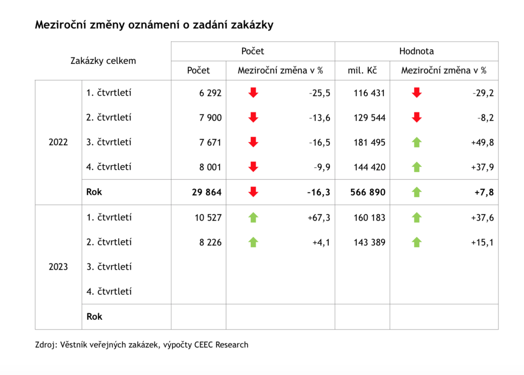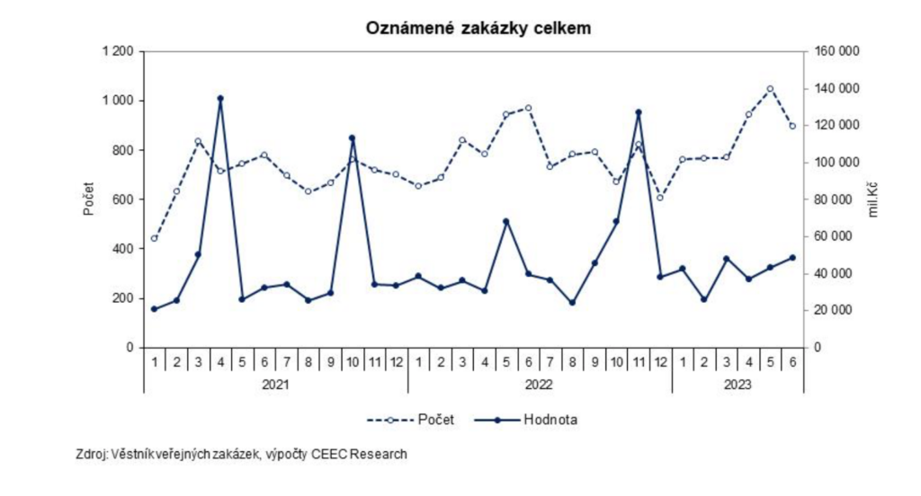 V 1. pololetí 2023 bylo vydáno 5 191 oznámení o veřejné zakázce, což ve srovnání se stejným obdobím předchozího roku představovalo růst o 6,3 %. Celková předpokládaná hodnota oznámení o zakázce činila 245,1 mld. Kč a byl zaznamenán její nepatrný růst o 0,1 %, což lze považovat spíše za stagnaci. Pokud bychom modelově posuzovali pouze zakázky s hodnotou pod 1 miliardu korun, dostaneme meziroční pokles hodnoty oznámených zakázek o 1,3 %.
