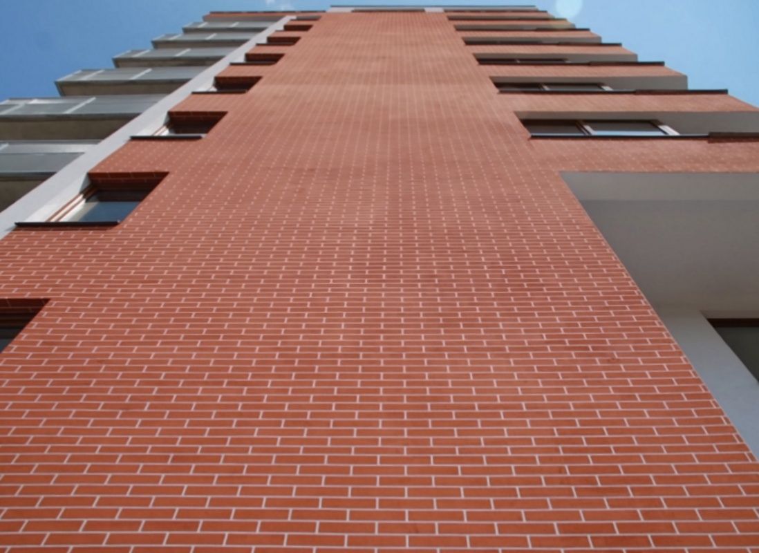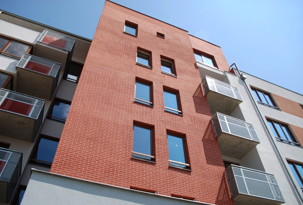 Tenkovrstvá designová akrylátová omítka pro tvorbu struktury cihlového zdiva nebo přírodního kamene Ceresit CT 60 VISAGE zdobí a chrání fasádu bytového domu, který byl dokončen letos v rámci projektu obytného objektu Čakovický part v městské části Praha-Čakovice.