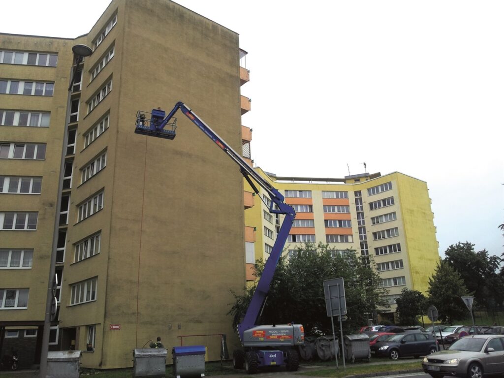 Ideálně za pomoci vysokotlakého zařízení s teplou vodou, případně páry nebo speciální trysky. Čisticí prostředek by měl být vhodný pro fasády a maximální tlak vody by neměl překročit 60 barů, aby nedošlo k poškození. Následně se fasáda důkladně opláchne a nechá zcela vyschnout. - Aplikace dezinfekčního prostředku