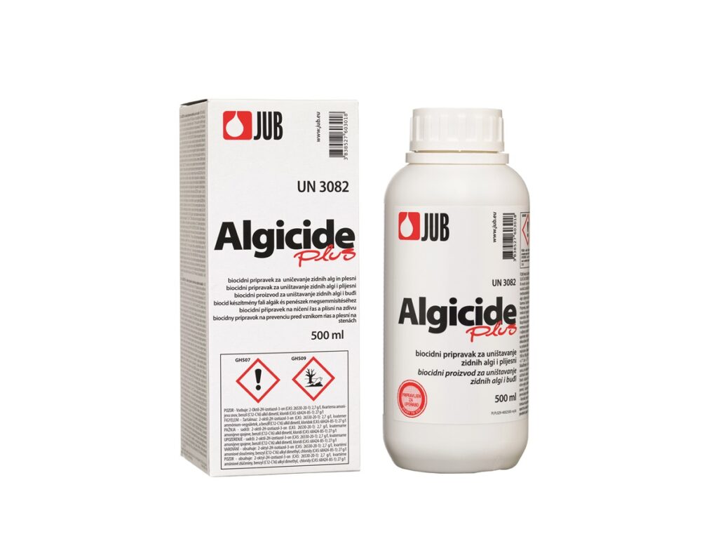K odstranění mikroorganismů se používá bezbarvý biocidní přípravek JUB ALGICIDE Plus, který proniká hluboko do podkladu a ničí široké spektrum řas a plísní. Neobsahuje chlor, nezatěžuje podklad solí a aplikuje se zředěný vodou v poměru 1 : 4. Nanáší se štětcem nebo válečkem, u silně zasažených ploch se doporučuje aplikace dvou vrstev. Tento přípravek se neoplachuje a po zaschnutí není zdraví škodlivý. - Základní nátěr