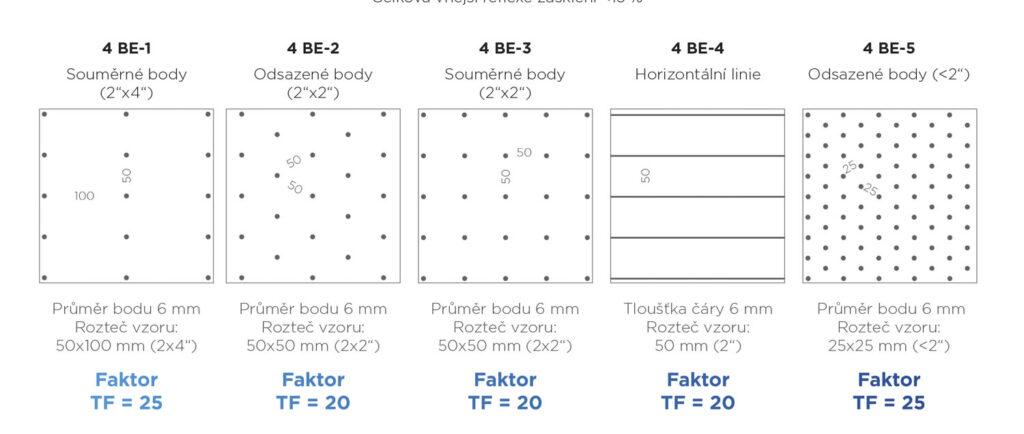 matování nebo PVB folie integrovaná ve vnější skleněné tabuli. Při použití kterékoliv metody platí