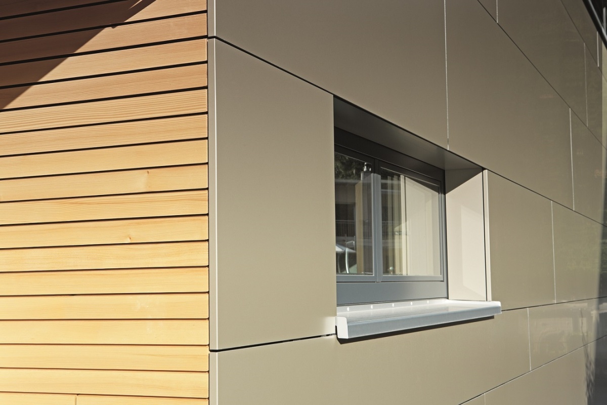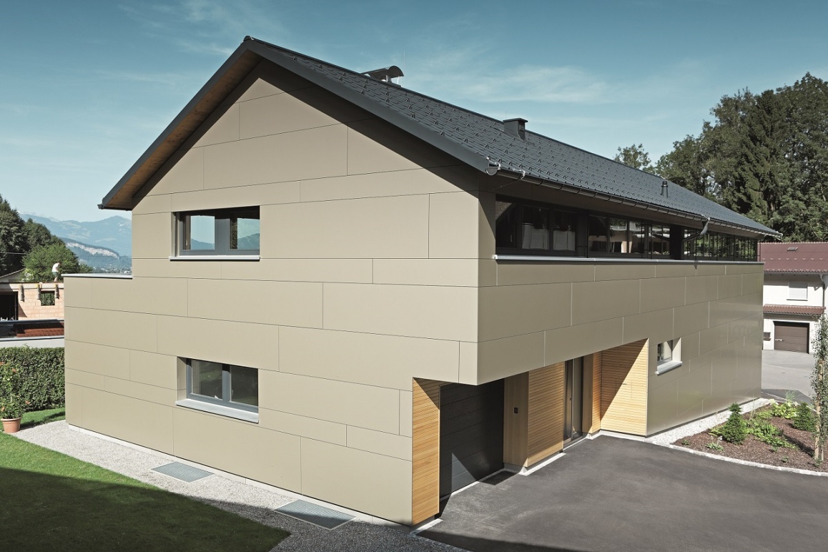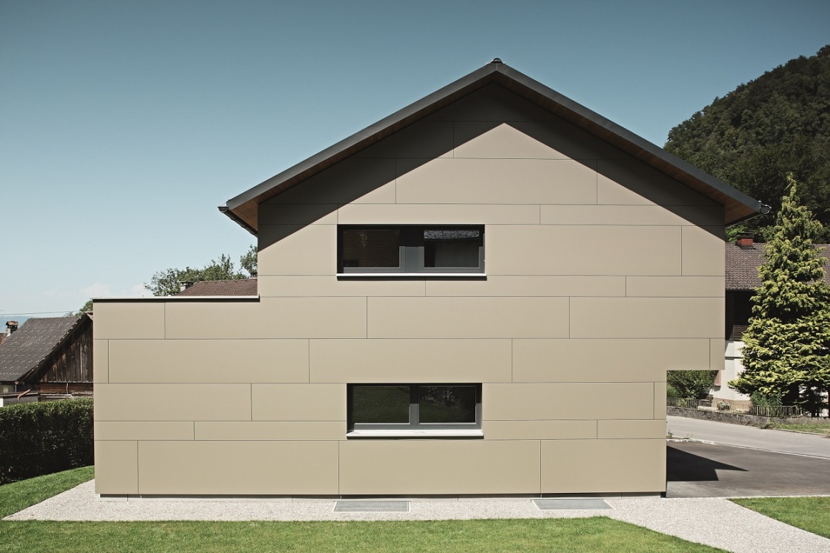 Pro fasádu o ploše 400 m2 v odstínu bronzové metalízy, která sahá až po štít střechy, padla volba na hliníkové kompozitní panely Reynobond. „Kompozitní panely Reynobond jsou jedním z nejvariabilnějších výrobků vůbec. Možnosti jejich použití jsou téměř nekonečné – od velkoplošných fasádních a střešních realizací, po balkóny a obklady tunelů, až po použití sendvičových panelů jako výplně obvodových stěn. Nejčastěji je ovšem Reynobond používán na odvětrávané fasády, stejně jako v tomto případě rodinného domu v Hohenemsu,“ popisuje Harald Kronthaler, projektant společnosti PREFA Aluminiumprodukte. Rozměr panelů musel být upraven na rozměr 1500×3645 mm. Vysoká tuhost a snadná tvarovatelnost přesvědčily investora Marca Aberera: „Kromě lehkosti desek na mě zapůsobila jejich jednoduchá montáž a jednoduchá zpracovatelnost. Moc se nám líbilo, jak snadno je možné ohýbat rohy. Ani při bližším pohledu nejsou vidět žádné řezné hrany okolo oken nebo v rozích domu, takže nic nenarušuje celkový ráz stavby.“