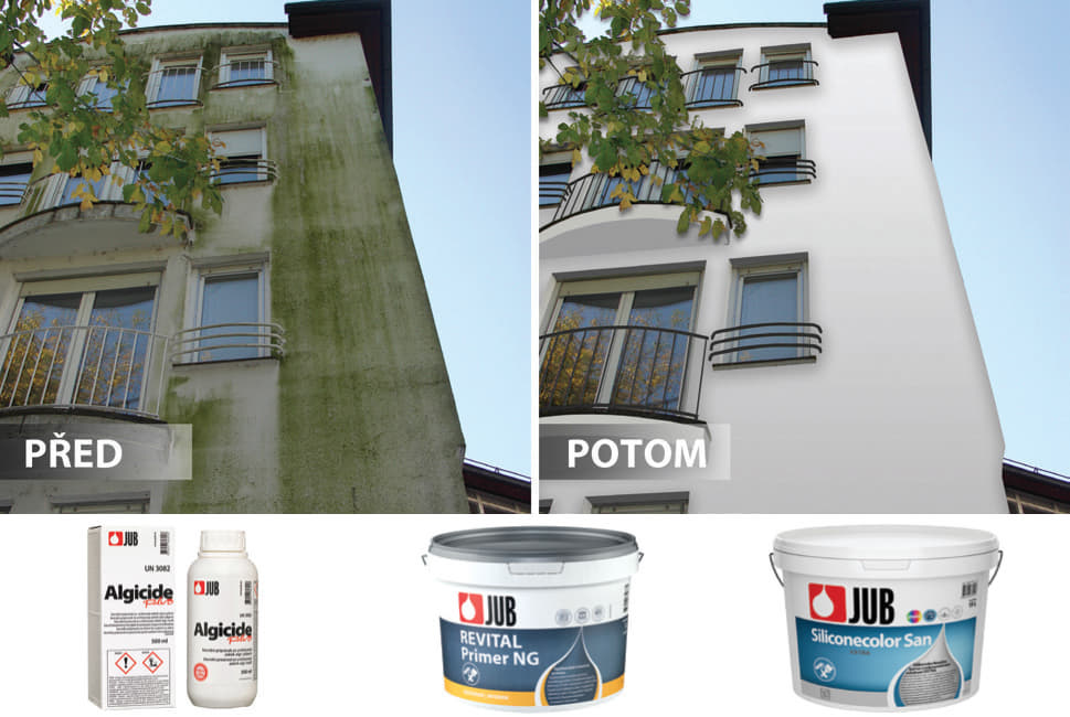 Pokud zárodky řas a plísní z povrchu fasády v rámci běžné údržby včas neodstraníme, hrozí její zrychlená degradace a v budoucnu se nevyhneme nákladnější opravě. Oprava je přitom nejenom finančně, ale i časově mnohonásobně náročnější a celkově obtížnější než standardní běžná údržba. Základní prevencí je proto pravidelné omývání a renovační nátěry. Mytím odstraníme všechny nečistoty, včetně těch organického původu a odebereme mikroorganismům zdroj živin. Novým nátěrem pak fasádu oživíme a obnovíme její původní vlastnosti. Pokud je podklad po důkladném omytí a vyschnutí soudržný (nedrolí se) a není napaden koloniemi řas a plísní (bez fleků a map), stačí nechat v doporučeném intervalu údržby nanést na původní fasádu základní nátěr např. JUB REVITAL Primer, který současně překlene případné mikropraskliny. Následně stačí ve dvou vrstvách aplikovat některou z osvědčených mikroarmovaných fasádních barev JUB.