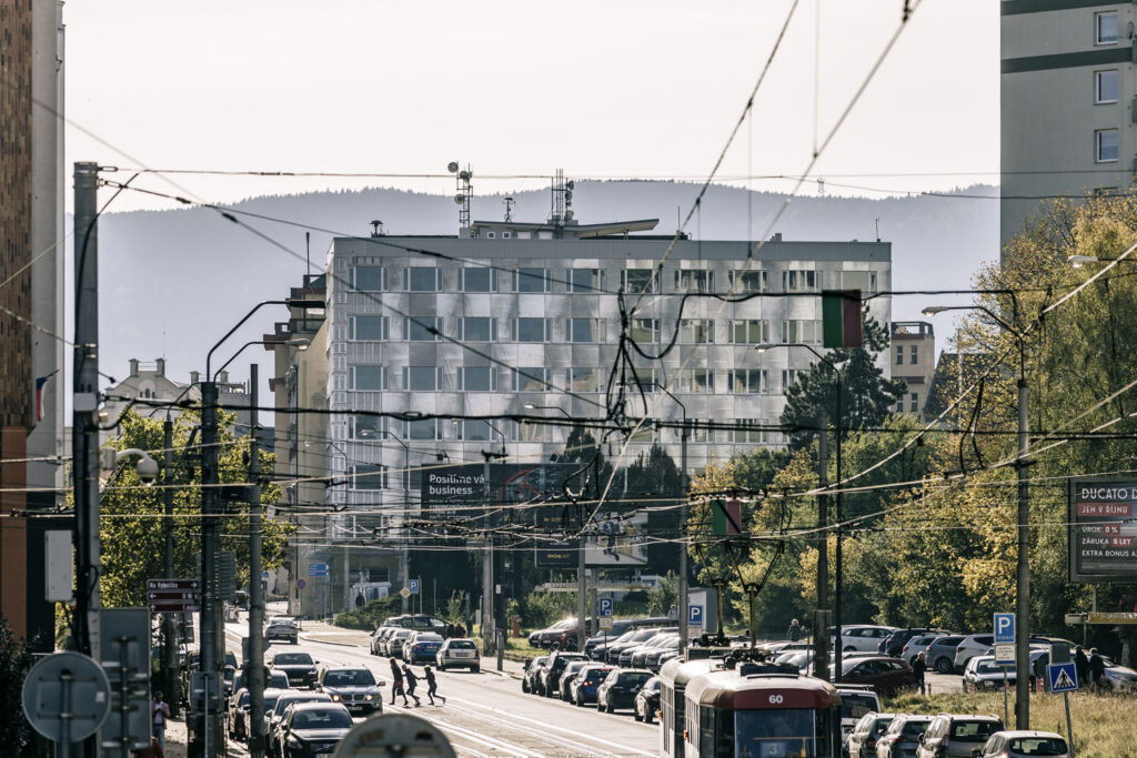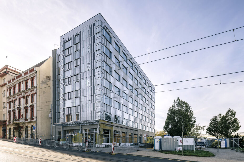 Návrh obnovy obvodového pláště navázal na výrazné horizontální členění fasády, byl dodržen i poměr mezi prosklenými a plnými částmi fasády, nezměnilo se ani drobné měřítko skladebných částí obkladu. „Navázali jsme i na tektonický skladebný systém. Pracovali jsme s různou hloubkou detailu odpovídající tomu, z jakých vzdáleností je stavba vidět. Výrazné horizontální členění a nápisy URAN jsou viditelné z centra města po ulici 1. máje i při průjezdu po dálnici od Prahy a Žitavy. Detaily obložení sloupů, stříška nad vstupem a jednotlivé torxové hlavy šroubů uchycení plechu jsou patrné při vstupu do vestibulu. Z indiferentní administrativní budovy 70. let minulého století se nám tak podařilo vytvořit jedinečnou stavbu,“ dodává architekt Ondřej Synek.