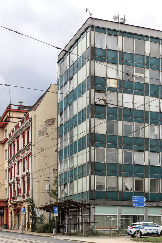 „U nosného systému budovy z montovaného ocelového skeletu jsme nenašli poruchy nebo závady, to se ale nedalo říci o jejím opláštění z boletických panelů. Objevily se na nich známé a hojně se vyskytující poruchy, zejména praskající smaltovaná skla, zatékání, netěsná okna, špatné tepelně technické parametry. Nepůsobily důstojným dojmem, navíc se muselo zbudovat ochranné lešení pro bezpečnost kolemjdoucích před odpadávajícími částmi. Naštěstí se nám podařilo uhájit názor, že budova nemá žádné zásadní problémy a je tedy třeba se zaměřit na obálkové konstrukce. S tím pak souvisely změny a úpravy na technických zařízeních jako je vytápění, chlazení a větrání,“ vzpomíná Ing. Zeman. Dodává: „Potěšilo mě, když jsem byl architekty osloven, abych se na základě svých zkušeností s realizacemi sanací lehkých obvodových plášťů stal členem projekčního a realizačního týmu. Na rozdíl od „běžného“ řešení byl ale jejich požadavek na projekt nového opláštění podstatně složitější, navíc nerespektoval stávající modulové členění. Nakonec jsme to přijali jako výzvu, která se pak na každém kroku projevila jako ještě komplikovanější. Základním předpokladem bylo využít rámy dílců boletických panelů. Průzkumné práce a sondy potvrdily obavy z lokálního zatékání, zejména jihozápadního nároží a přilehlých fasád. Zároveň se ale vyloučila přítomnost azbestových vláken v deskových výplních.“