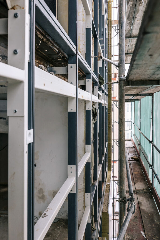 Již v rámci přípravy bylo zřejmé, že realizace nebude jednoduchá. V první etapě se započalo s demontáží na nároží, které bylo poškozené zatékáním. V minulosti navíc proběhl naprosto neodborný zásah na západním štítu, zateplení z interiéru bez jakékoliv difuzní uzávěry. Způsobilo to intenzivní kondenzace přesně v rovině ocelových rámů, takže některé části musely být nahrazeny. „Jednotlivé případy tak bylo třeba staticky posoudit a práce se tak zdržely. V rámci projekčních prací jsme s tím počítali, ale „rezervu“ jsme vyčerpali hned na začátku. Následně se však potvrdilo, že zbytek fasády je téměř v naprostém pořádku a druhá etapa proběhla za méně než poloviční čas, přestože byla větší a prostorově náročnější. Příznivě se projevila i skutečnost, že po geodetickém zaměření obnažených rámů fasády byly maximální odchylky jak v plošné rovině, tak i výškově jen do 10 mm. To potvrdilo moji zkušenost – u ocelové konstrukce hlavního skeletu bývají rozdíly malé, ale u montovaného skeletu z prefa dílců už jsem zažil disproporce i 5 cm,“ dodává Ivo Zeman.