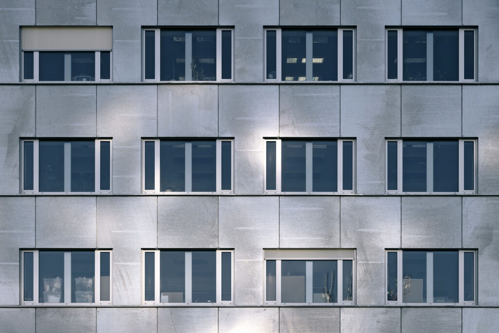 „Když jsme přemýšleli o žárově zinkovaném plechu, ověřovali jsme si toto řešení na referenčních stavbách, například na budově Aquilla od ateliéru Christ a Gantenbein. Během návrhu jsme nechali zhotovit vzorky plechů v měřítku 1:1, abychom si ověřili realizovatelnost a vliv tvaru a metody ořezu na proces žárového zinkování. Bylo to důležité především u velkých profilů T tvaru – jejich délka dosahuje 3,3 m a jsou tak výrazně větší než na dostupných zahraničních referencích. Plechová fasáda zároveň tvoří masku celého technického řešení, detailů kolem oken a technických spojů fasády,“ uvádí architekt Jiří Žid.