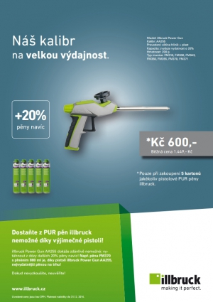 Pistole je nyní ve speciální nabídce za pouhých 600 Kč (běžná cena je 1449 Kč) při zakoupení pěti kartonů jakékoliv pistolové pěny Illbruck. Nabídka platí do 31. 12. 2014.