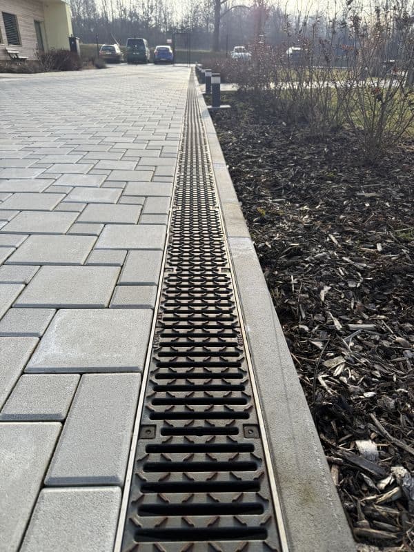 Pro řešení odvodnění zpevněných ploch v okolí budovy byly použity odvodňovací žlaby systému MEADRAIN EN z polymerického betonu, které jsou navrženy tak, aby bezpečně odváděly dešťovou vodu i v místech s vyšším zatížením.