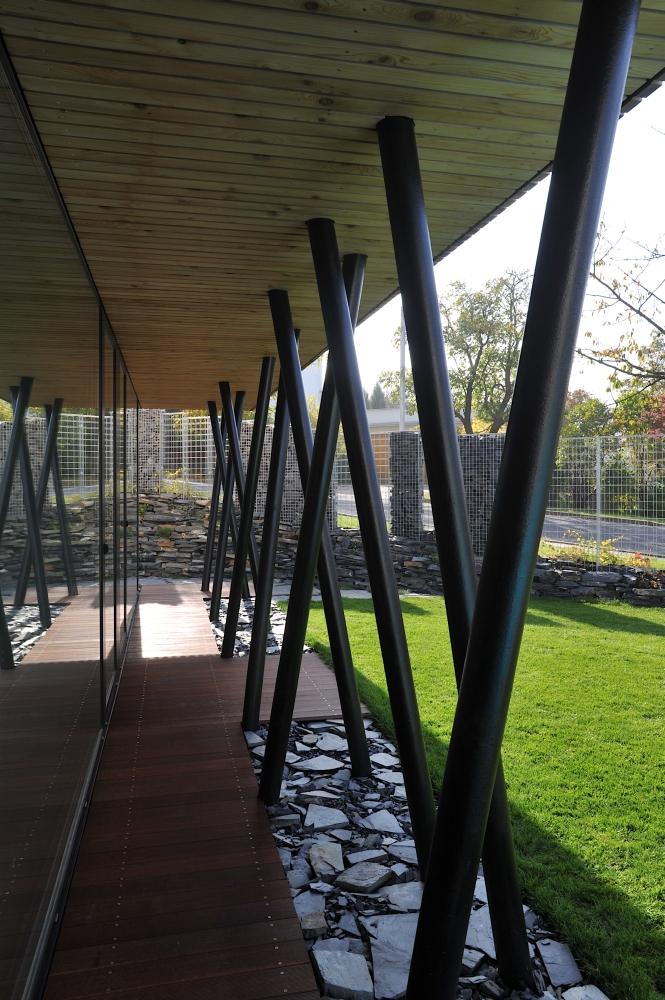 Fasáda se maximálně snaží vyhovět požadavku na bezúdržbovost. Na vnějším plášti najdeme kombinované obložení z cedru a cortenového plechu, některé plochy jsou ponechány z pohledového betonu. Obrácená střecha s hydroizolací z těžkých asfaltových pásů a zásypem z říčních oblázků nahrazuje klasickou střešní krytinu. „Tvorba studie a následně projektu měla poměrně rychlý průběh. Díky konstruktivní diskusi s investorem, který věděl, co chce, se nám bez obtíží dařilo mozaiku materiálů skládat do smysluplného celku,“ popisuje spolupráci Libor Chovanec z OK Plan Architects, s. r. o. „Investor se nebránil experimentování s materiály, které jsme na této stavbě použili poprvé. Například gletované štuky v interiérech dopadly velmi dobře. Také zpracování cedrové fasády v exteriéru je v detailu precizní,“ dodává Libor Chovanec.