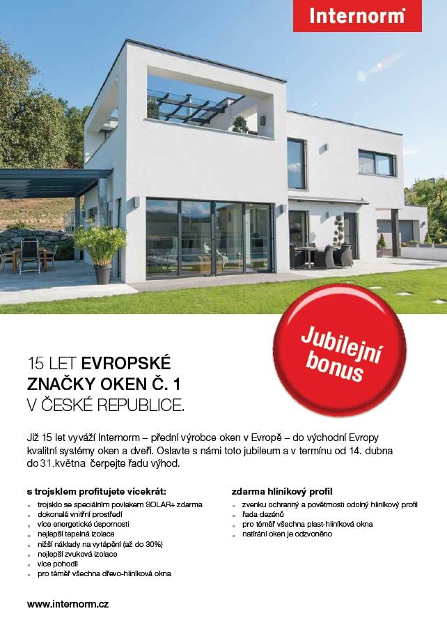 Společnost Internorm slaví 15 let. Při této příležitosti má pro své zákazníky mimořádnou nabídku: od 14. dubna do 31. května 2014 le možné získat zdarma trojsklo SOLAR+ a zdarma předsazený hliník na vnější stranu okna.