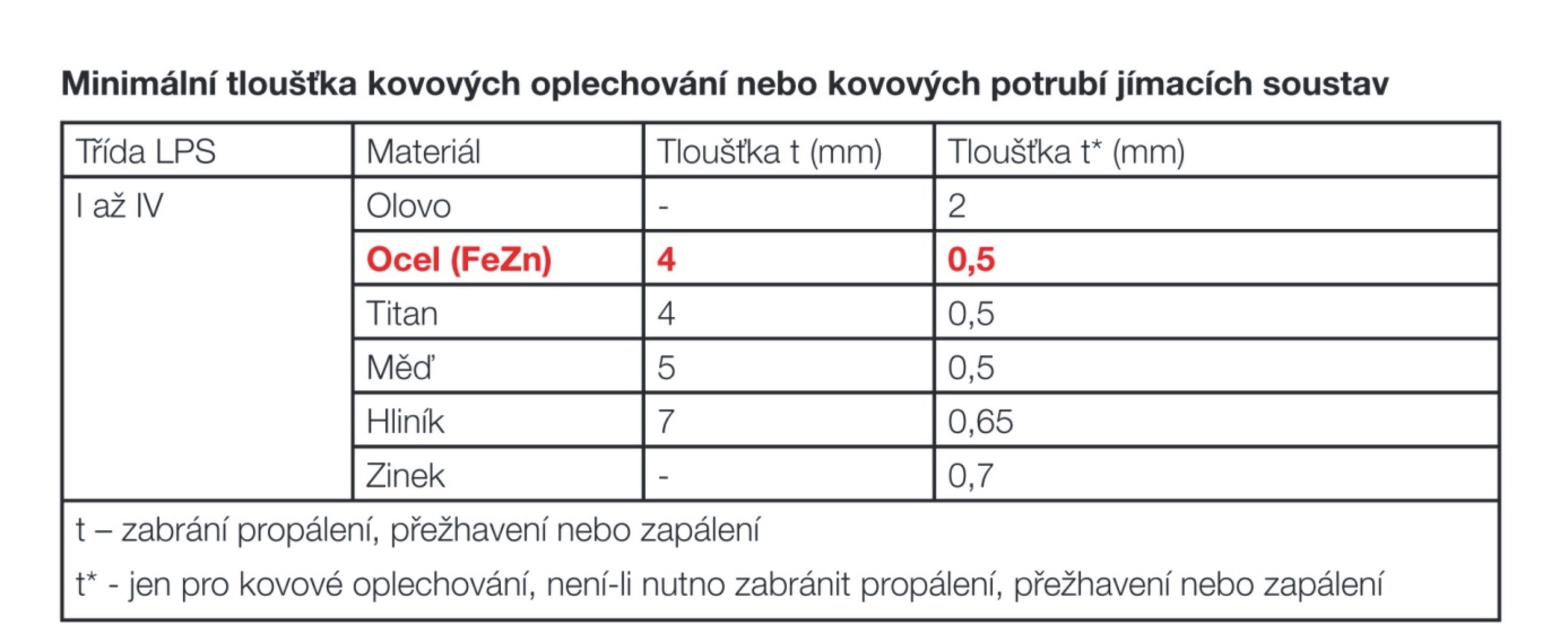 Za určitých okolností můžeme uvažovat, že krytina působí jako náhodný jímač výbojů. V takovém případě lze předpokládat, že samotná krytina vzájemně vodivě pospojovaná dokáže přijmout výboj a předat ho do svodu. Pokud se však přistoupí k takovému řešení, je třeba počítat s tím, že při úderu dojde k propálení krytiny. Na tento jev myslí ČSN EN 62305 Ochrana před bleskem – Hmotné škody a nebezpečí života, která uvádí, že minimální tloušťka materiálu odolná proti propálení úderem je v případě pozinkované oceli 4 mm. Vzhledem k tomu, že krytiny Lindab se vyrábějí v loušťkách 0,5–0,7 mm, pohybují se na samé hranici použitelnosti pouze jako náhodný jímač. Minimální hodnoty pro oba případy jsou uvedeny v přiložené tabulce, vyňaté z výše uvedené normy.