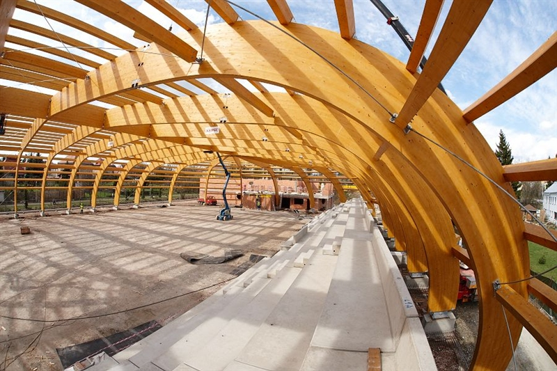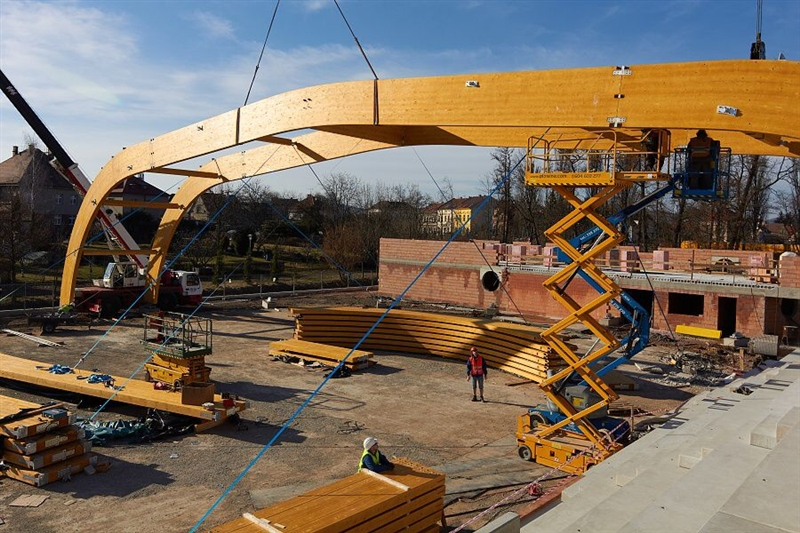 Jičínský zimní stadion chystá se po zásadní rekonstrukci chystá na nadcházející zimu. Unikátní dřevěná nosná konstrukce stavby, jejímž investorem je město Jičín a generálním dodavatelem společnost VCES a.s., již stojí. Realizovala ji trutnovská firma KASPER CZ.