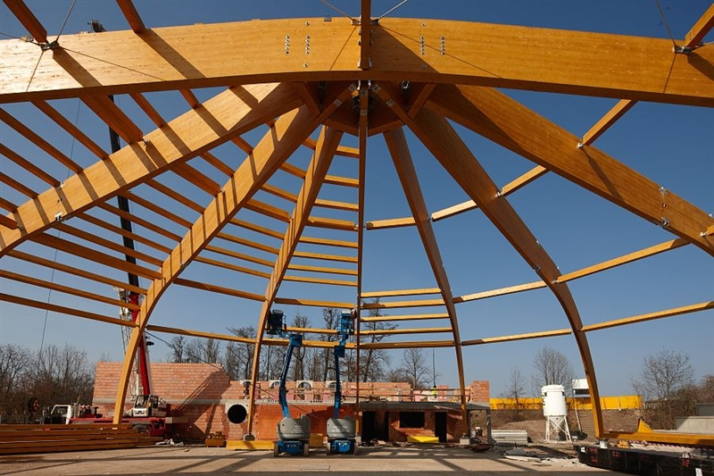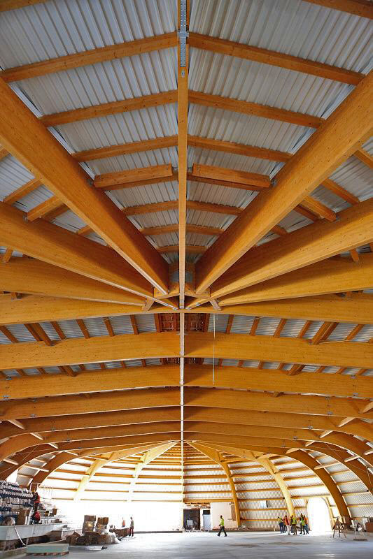 Hala je na obou stranách ukončena půlobloukovou valbou tvořenou sedmi půlrámy profilu 180/1389 mm, jež jsou tvarově shodné s rámem hlavním. Největším prvkem je střední část hlavního rámu, která měří dvaadvacet metrů a váží téměř čtyři tuny. Prostorovou tuhost zajišťují tři prstence ztužidel, které jsou doplněny v hlavní části hřebenovým ztužidlem a ocelovými táhly umístěnými ve dvou krajních polích hlavních rámů. Hlavní nosné spoje jsou řešeny pomocí osově zatížených vysokopevnostních šroubů, přičemž přenos sil do dřeva zajišťují osově namáhané vruty.