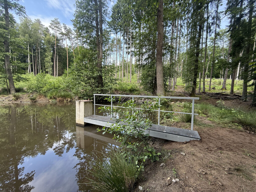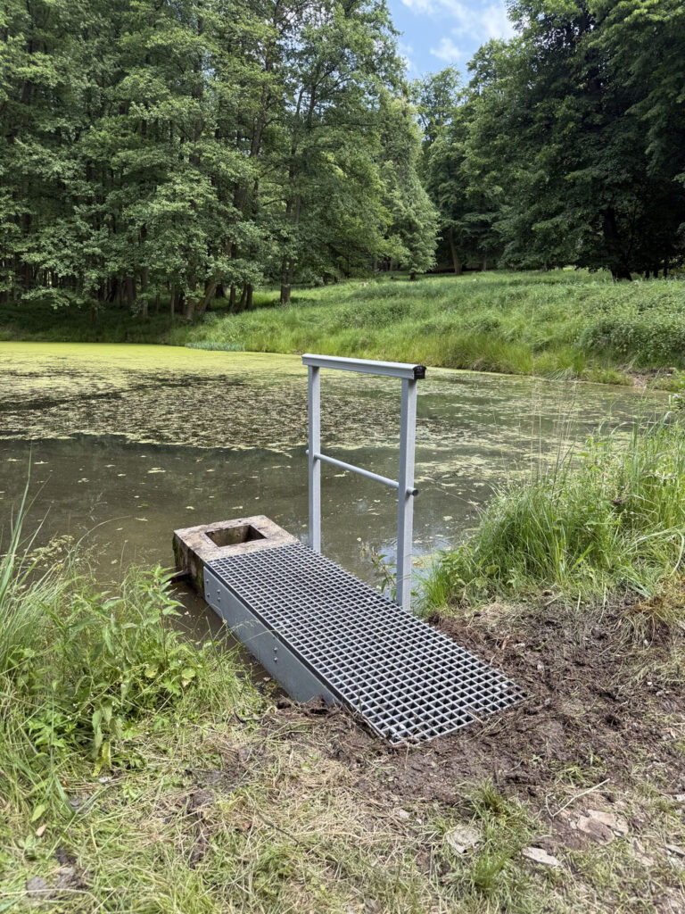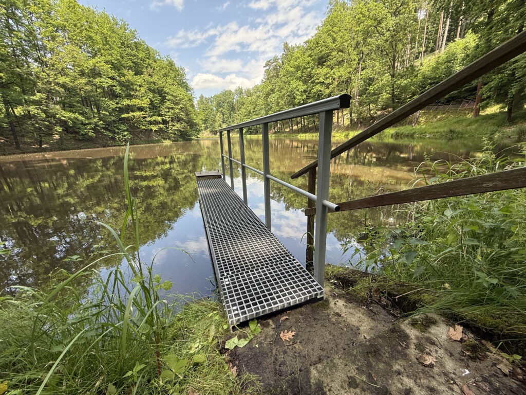 Správci lesní obory u Hluboké nad Vltavou potřebovali letos v květnu obnovit obslužné lávky k požerákům u pěti rybníků.  Přístup k rybníkům je velice omezený, jsou vzdálené od lesní cesty a terén je místy extrémně svažitý. Způsob dopravy, manipulace s lávkami, jejich instalace a také jejich dlouhá životnost hrály důležitou roli při volbě konstrukčního materiálu.
