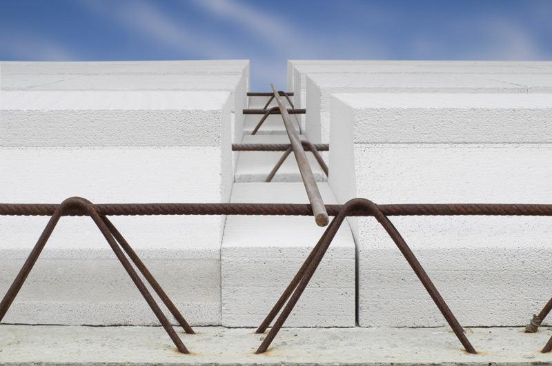 V průběhu betonáže střešní konstrukce si připravíme kotevní prvky pro zamýšlený zateplovací systém. Ještě před zavadnutím betonu do něj osadíme v místech žeber závitové tyče. Tyče vkládáme v pravidelných intervalech podle rozměrů navržených izolačních desek v ose budoucích kontralatí. Po ztuhnutí betonu se na střechu nalepí v řadách izolační desky, postupuje se odspodu nahoru. Na závitové tyče se pak nasadí kontralatě, které se maticemi přitáhnou k povrchu izolačních desek.
