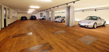 Garáž skrývá splněný sen nadšeného milovníka klasických luxusních vozů. Na ploše 300 m2, realizované německou rodinnou firmy Drüsedau z hesenského Kellerwaldu, jsou umístěny automobily Porsche, Ferrari nebo Bentley – celkem devět historických vozů, úhledně seřazených v parkovacích stáních. Celek pak doplňují motocykly.