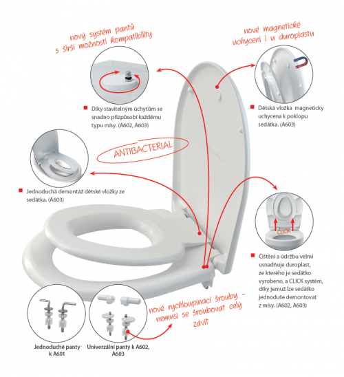 Díky stavitelným úchytům se sedátka snadno přizpůsobí každému typu mísy. Typ A603 obsahuje demontovatelnou dětskou vložku, uchycenou k poklopu sedátka pomocí magnetu.