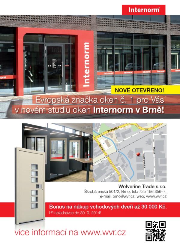 Společnost Internorm otevřela nové studio oken v Brně. Při objednávce do 30. 9. 2014 můžete získat bonus až 30 000 Kč na nákup vchodových dveří.