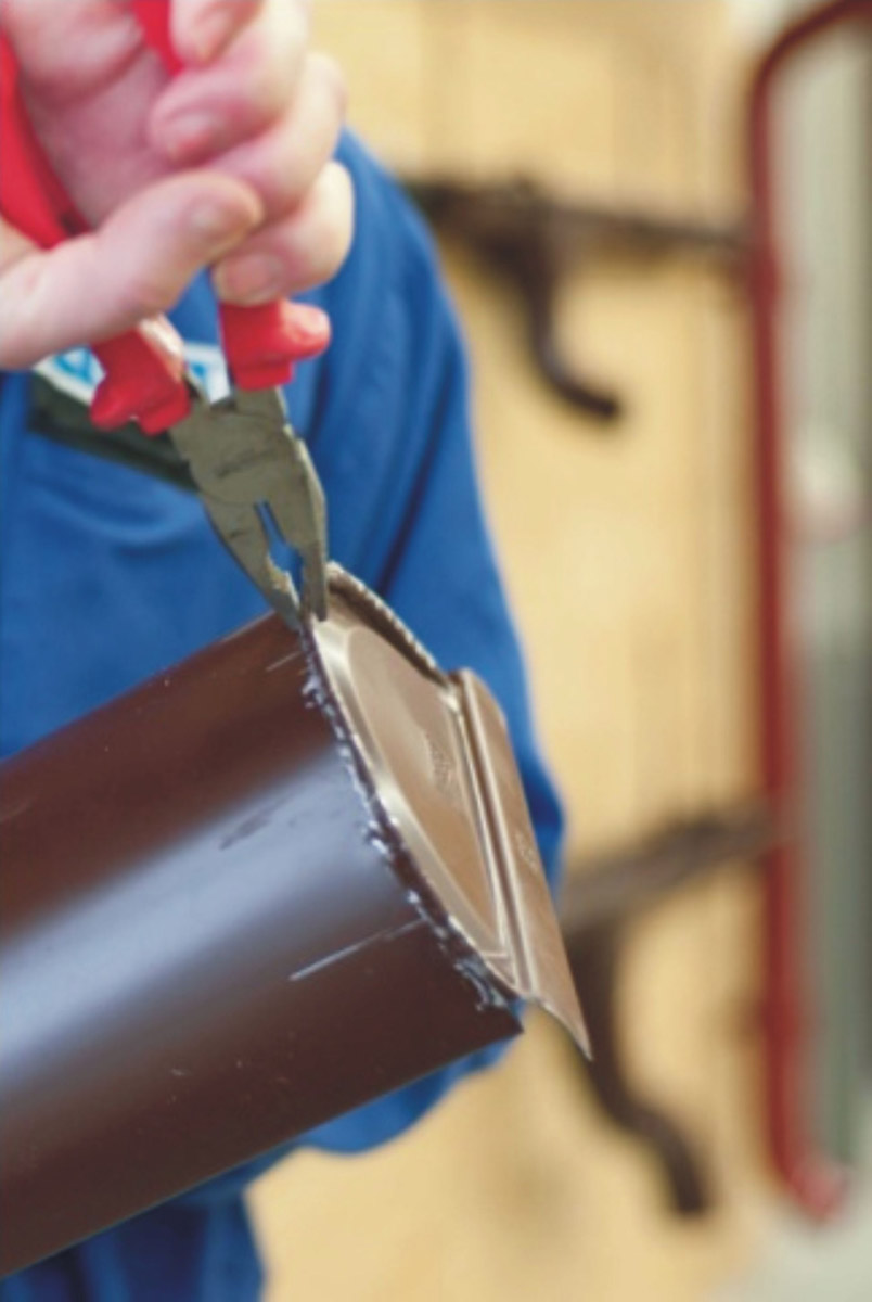 1. Instalace čela běžně dostupného okapového systému, pro jehož upevnění je zapotřebí opertlovat konec žlabu a to s patřičnou přesností, tak, aby si na připravenou hranu čelo dobře sedlo. Po té je zapotřebí pomocí kleští či kladiva dostatečně uzavřít čelo po celém obvodu, aby se vytvořil pevný a těsný spoj. Jakmile je tato část montáže dokončena, je nutné přetmelení v místě spoje. Instalace tohoto typu čela mi trvala 10–15 minut a musím konstatovat, že výsledek pro mě nebyl příliš uspokojivý. Díky pracovnímu postupu a velmi nekvalitní povrchové úpravě došlo ke značnému poškození, jak čela tak podokapního žlabu. Vzhledem k tomu že první pokus proběhl neúspěšně, byl jsem nucen opětovně zastřihnout hranu žlabu, použít nové čelo a celé si to zopakovat. Představa, že by na mě u reálné montáže, čekala minimálně další tři žlabová čela, není příliš optimistická.