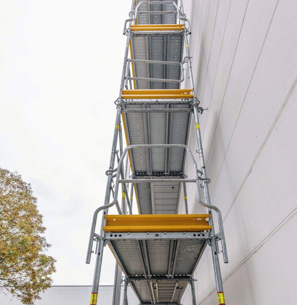 - Bezpečnostní prvky: Lešení je vybaveno pokročilými bezpečnostními prvky minimalizujícími riziko pracovních úrazů, včetně pádů z výšky.