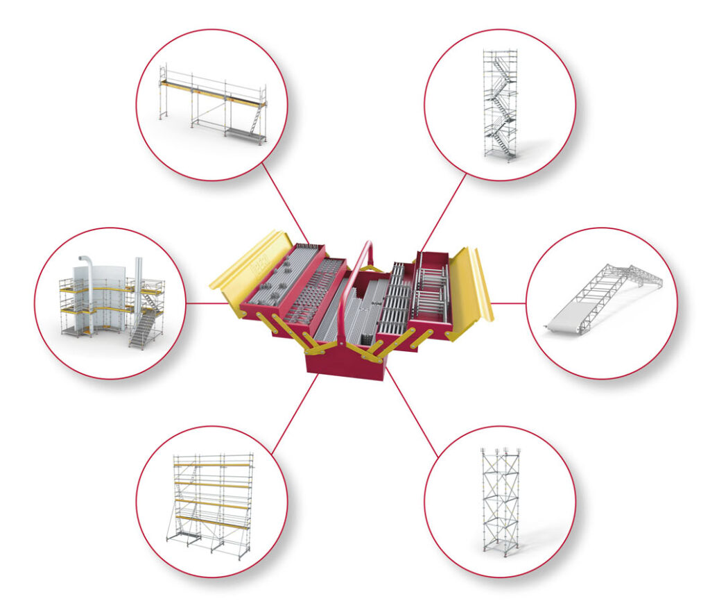 Kombinací rámového a modulového lešení navíc vznikají různé možnosti nasazení, které umožňují obestavět jakoukoli budovu a jakýkoli terén. Při vhodném seskládání tak lze dorovnat výškové rozdíly, obestavět překážky, integrovat schodiště a materiálové a ochranné lávky a montovat konzoly ve výškovém modulu 50 cm.
