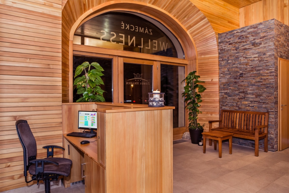 Zámecké wellness pak navazuje na tradici zaniklých vodních a vzdušných lázní v nedaleké obci Odolenov na svazích vrchu Svatobor. U technického řešení upoutá kombinace přírodního kamene a dřevěného obkladu a důmyslné skrytí všech technických prvků (vzduchotechnika, osvětlení, topení, ozvučení). Osvědčila se i stavební chemie Ceresit, která se uplatnila v bazénové hale: „Jsou to kvalitní výrobky, které splňují výrobcem deklarované vlastnosti, snadno zpracovatelné s přijatelnou cenou. Uvítali jsme kompletní řešení stavební chemie bazénu a komplexní technickou podporu a poradenství,“ řekl Ing. Pavel Vinický ze společnosti ŠUMAVAPLAN.
