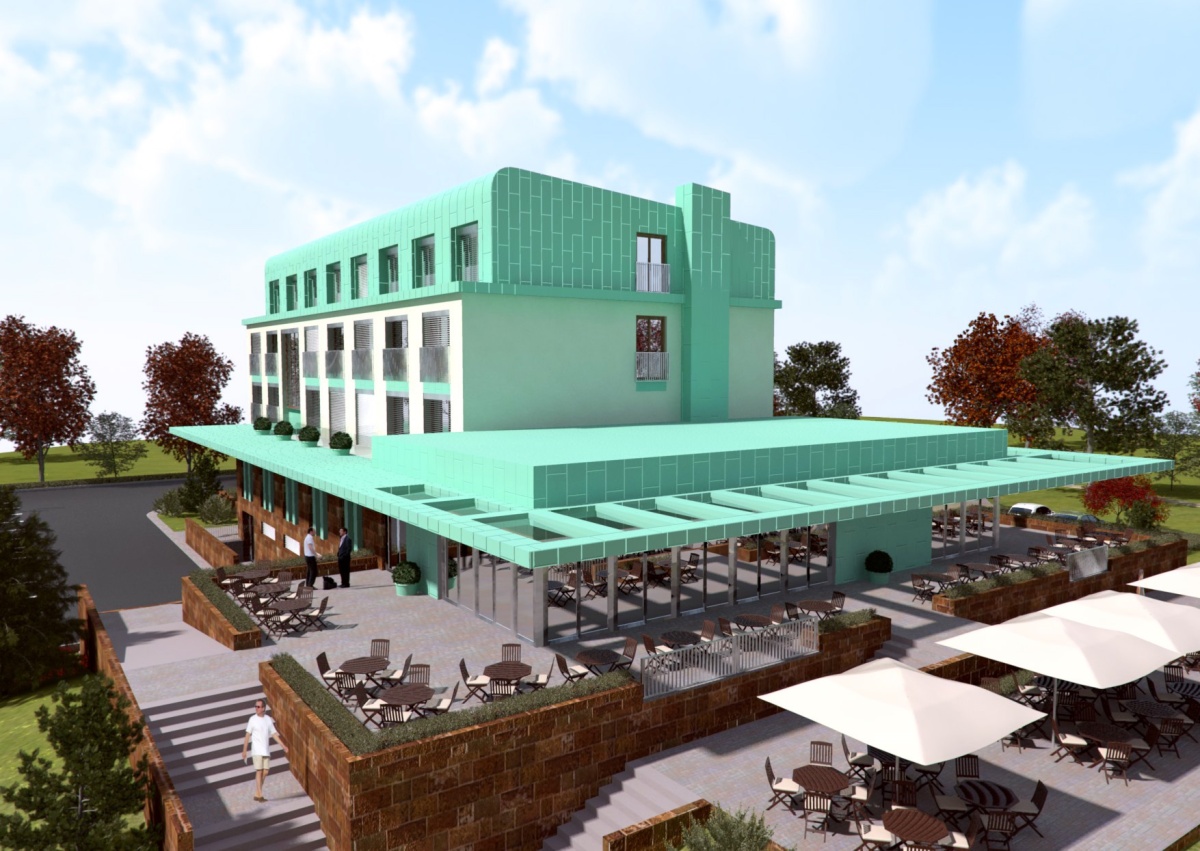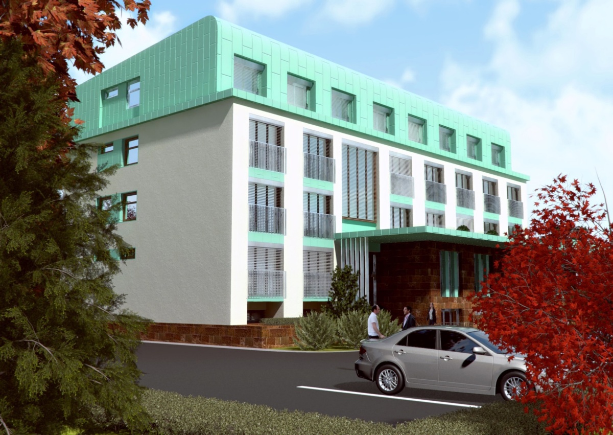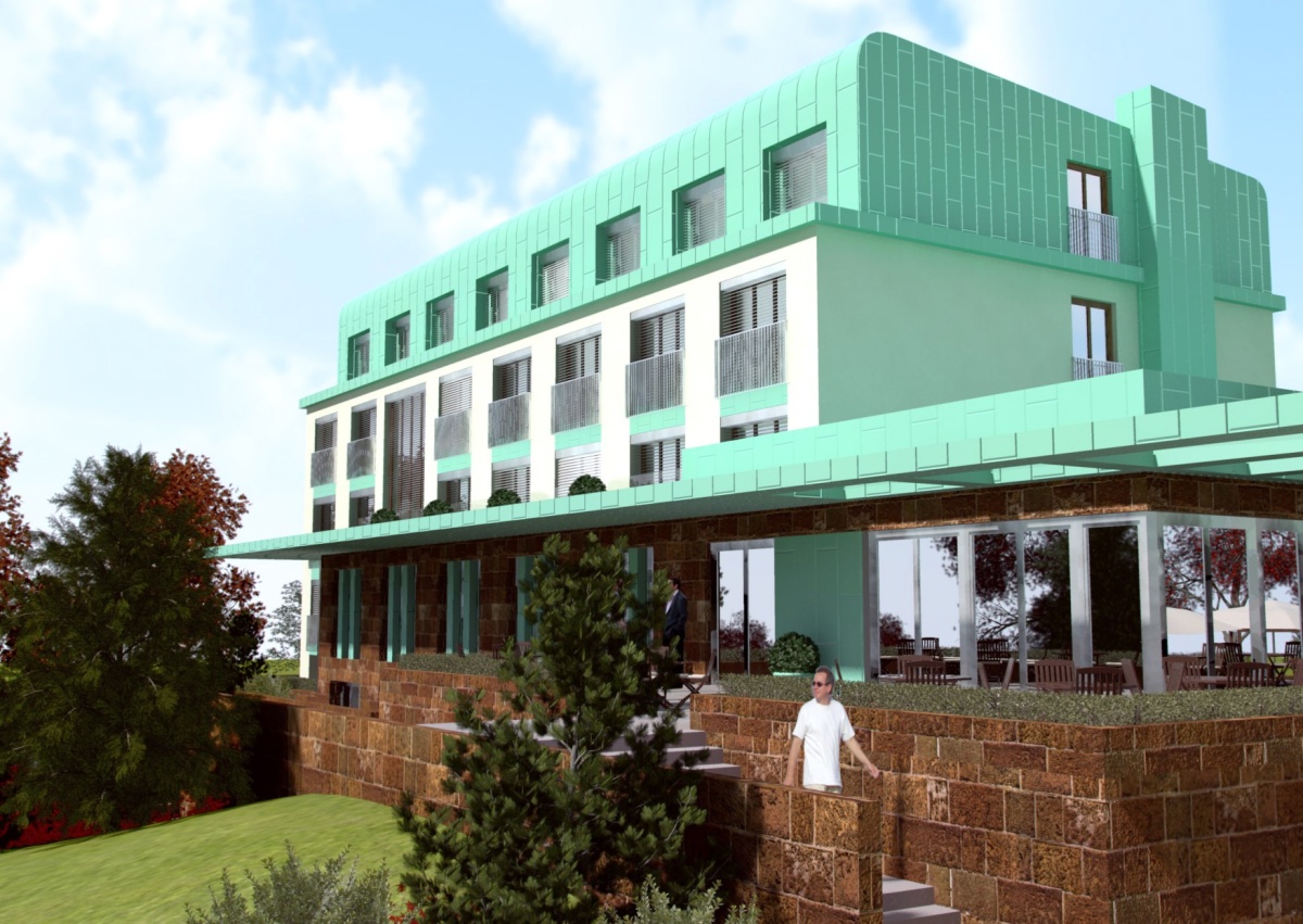 Největší změny se týkaly střechy a nového přístřešku pro parkování aut. Původní plochá střecha byla přepracována na pultovou se spádem 10 °. Obě podélné strany přecházejí obloukem plynule do fasády. Ukončení fasády ve výšce podlahy posledního patra ústí do hranatého římsového žlabu. Střecha parkoviště navazující na přízemí hotelu je také pultová s minimálním spádem. Navrhovaným materiálem byl falcovaný plech v barvě připomínající předzvětralou měď. Mimo požadavků na vysokou kvalitu a dlouhodobou životnost se investor zajímal o způsob provedení všech důležitých detailů. Vysvětlit technický postup a vidět ho na vlastní oči jsou však dvě zcela rozdílné věci. Společnost PREFA Aluminiumprodukte proto navrhla panu Bartošovi možnost navštívit jinou stavbu podobného typu, která se toho času dokončovala právě v Beskydech. Rodinný dům atypických tvarů na první pohled zaujal množstvím složitých klempířských detailů a precizností provedené práce. Výjimečný vzhled a zpracování pak vedly pana Bartoše k volbě materiálu a kvalitní klempířské firmy. Použit byl hliníkový plech PREFALZ v barvě patina zelená, hlavním zhotovitelem projektu se stalo klempířství Antonína Ondrůška. Díky patří i pracovníkům firmy Jiřího Rašky.