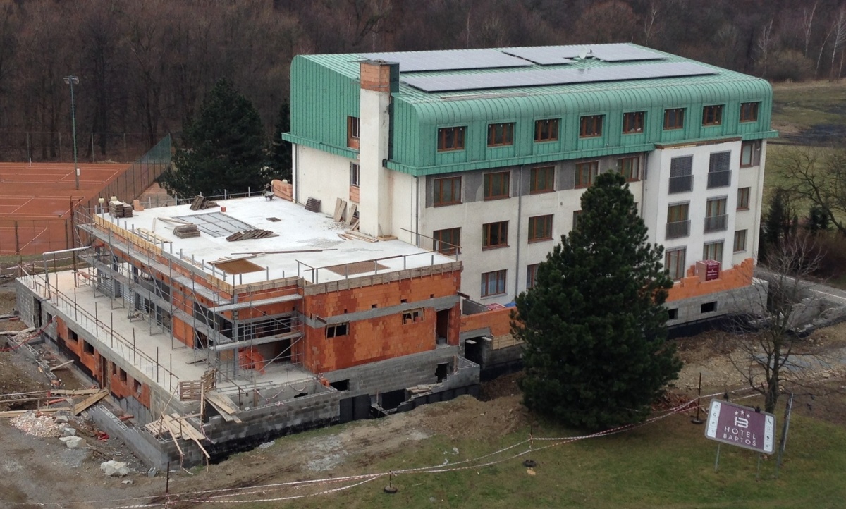 Jak už bývá v dnešní době zvykem, snahou každého majitele objektu je snížit provozní náklady na minimum. Cena energií neustále roste, což se nejvíce dotýká velkých nemovitostí sloužících pro veřejnost. I pan Bartoš v projektu přemýšlel o fotovoltaické elektrárně. Myslet na budoucnost je v jakémkoliv oboru velmi důležitá věc a instalace alternativního zdroje energie pro hotel k nim určitě patří. Střešní spád 10 ° a orientace budovy na jih toto rozhodnutí jen podpořily.