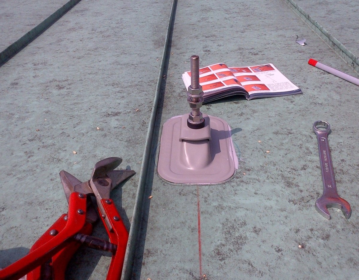 Základ instalace tvoří nosná hliníková konstrukce, kterou vynáší solární držáky PREFA Sunny šroubované do krokve. Jejich tvar a speciální skladba nebrání pohybu materiálu vlivem teplotní roztažnosti. V plechu se vystřihne oválný otvor s délkou 40 mm a jeho kraje se po celém obvodu zvednou o 10 mm. To zajistí, aby se vlhkost vniklá pod krytku držáku nedostala do podstřeší. Šroub se kotví do krokve, krytka držáku je pak přilepena speciální sadou přímo na plech. K solárním držákům se připojují hliníkové vaznice tvořící nosný rošt pro fotovoltaické panely. Celý systém PS.13 zahrnuje kompletní montáž do střešní konstrukce, fotovoltaické panely E2000, střídače Fronius a kabeláž končící rozvaděčem.
